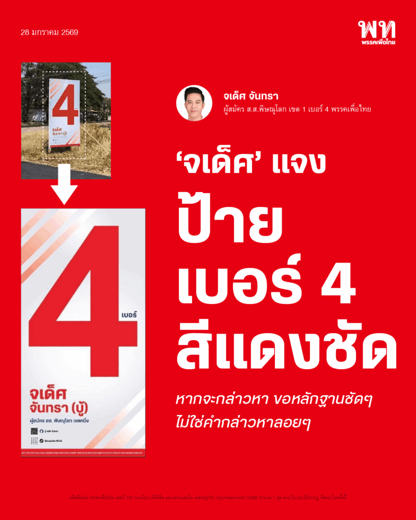 “จเด็ศ” ตอบกลับ “ปดิพัทธ์” แจงชัดปมป้ายเบอร์ 4 คือ ”สีแดง“ ตามแบบ แต่ยินดีแก้ไขให้ชัดเจน – โต้ข่าวลือแนะคนเลือกพรรคอื่น – นัดล้างตาพร้อมเจอหน้าบนเวทีดีเบต 31 ม.ค.นี้