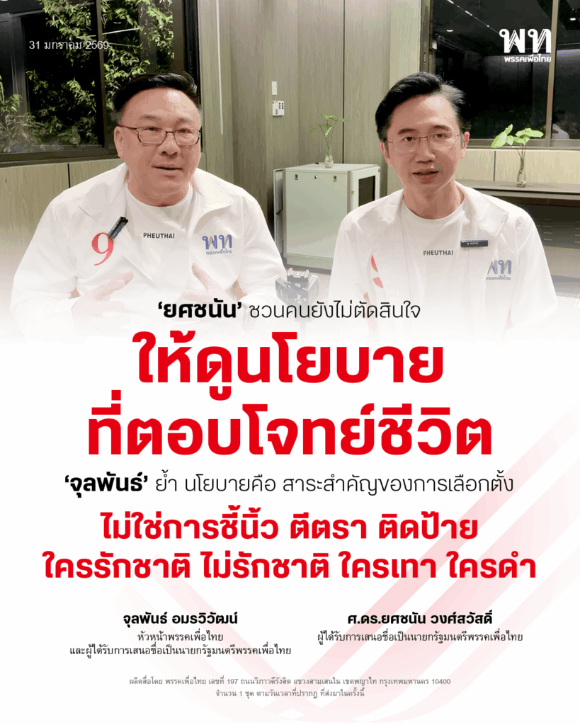 เมื่อวันที่ 30 ม.ค. 2569 ศ.ดร.ยศชนัน วงศ์สวัสดิ์ แคนดิเดตนายกรัฐมนตรีของพรรคเพื่อไทย พร้อมนายจุลพันธ์ อมรวิวัฒน์ หัวหน้าพรรคเพื่อไทย และแคนดิเดตนายกรัฐมนตรีของพรรค ร่วมกัน live พูดคุยสื่อสารนโยบายกับพี่น้องประชาชน ผ่านทางเฟซบุ๊กเพจพรรค