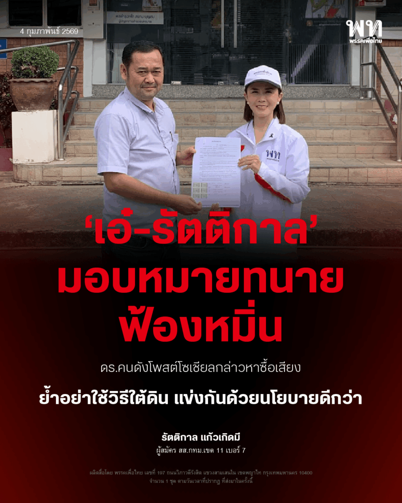 ‘เอ๋-รัตติกาล’ ผู้สมัคร สส.กทม.เพื่อไทย มอบหมายทนายฟ้องหมิ่น ดร.คนดังโพสต์โซเชียลกล่าวหาซื้อเสียง ย้ำอย่าใช้วิธีใต้ดิน วอนแข่งกันด้วยนโยบายดีกว่า