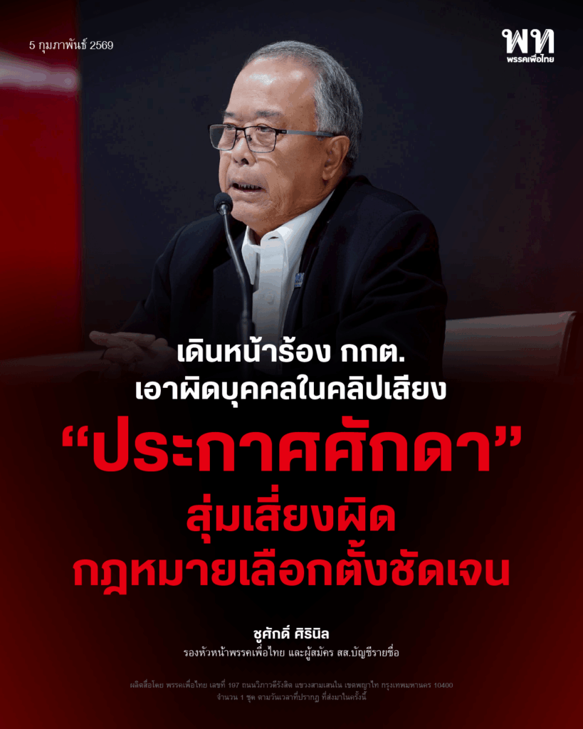 วันที่ 5 กุมภาพันธ์ 2569 เวลา 10.30 น. ที่ พรรคเพื่อไทย กรุงเทพฯ นายชูศักดิ์ ศิรินิล รองหัวหน้าพรรคเพื่อไทย และผู้สมัคร สส.บัญชีรายชื่อ พร้อมด้วย นายศึกษิษฏ์ ศรีจอมขวัญ โฆษกพรรคเพื่อไทย และผู้สมัคร สส.บัญชีรายชื่อ, นายนรวิชญ์ หล้าแหล่ง ผู้สมัคร สส.บัญชีรายชื่อ, นายพนม โพธิ์แก้ว (สส.ไก่) ผู้สมัคร สส.กาญจนบุรี เขต 5, นายอานนท์ ถนอมวงษ์ (สจ.ตูน) อดีต ส.อบจ.กาญจนบุรี แถลงข่าวกรณีคลิปเสียงการสนทนา “ประกาศศักดา” ที่มีเสียงชายปริศนาคนหนึ่งโทรศัพท์คุยกับ สจ.รายหนึ่ง เพื่อให้ช่วยสนับสนุนการเลือกตั้งในพื้นที่จังหวัดกาญจนบุรี