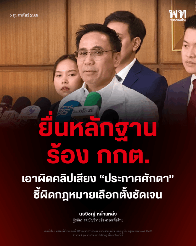วันที่ 5 กุมภาพันธ์ 2569 นายนรวิชญ์ หล้าแหล่ง ผู้สมัคร สส.บัญชีรายชื่อพรรคเพื่อไทย เป็นตัวแทนพรรค เข้ายื่นเรื่องร้องเรียนต่อคณะกรรมการการเลือกตั้ง (กกต.) กรณีคลิปเสียงการสนทนา “ประกาศศักดา” ที่มีเสียงชายปริศนาคนหนึ่งโทรศัพท์คุยกับ สจ.รายหนึ่ง เพื่อให้ช่วยสนับสนุนการเลือกตั้งในพื้นที่จังหวัดกาญจนบุรี