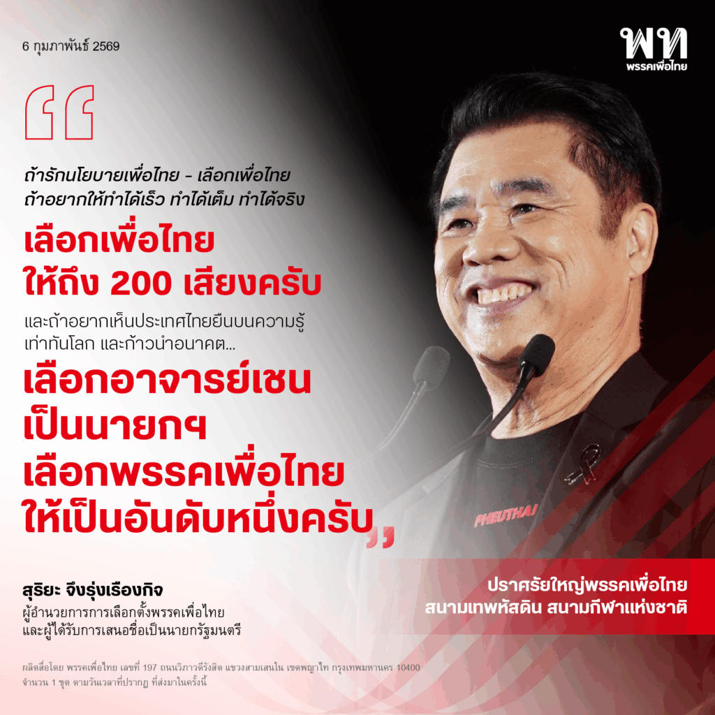 “ขอถามแบบจริงใจ ถ้าไม่ใช่เพื่อไทย แล้วพี่น้องคิดว่าใครจะทำได้ เพราะนโยบายมันคิดยาก ลอกง่าย แต่ทำยาก แต่ทำนโยบายที่ทำจริงต้องมี 3 อย่างพร้อมกัน มีทีมที่เคยทำงานจริง มีประสบการณ์ เข้าใจทั้งระบบราชการ กฎหมาย งบประมาณ กลไกสภา มีความละเอียด ไม่ใช่เขียนเอาหล่อ เอาเท่ เอาไว้พูดบนเวทีอย่างเดียว” นายสุริยะกล่าว
