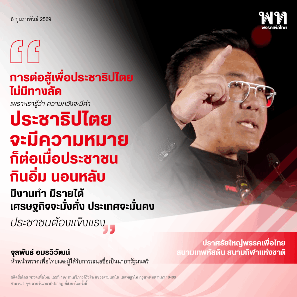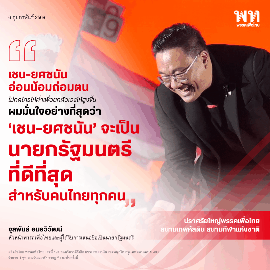วันที่ 6 กุมภาพันธ์ 2569 ที่สนามเทพหัสดิน สนามกีฬาแห่งชาติ นายจุลพันธ์ อมรวิวัฒน์ หัวหน้าพรรคเพื่อไทย และแคนดิเดตนายกรัฐมนตรี กล่าวบนเวทีปราศรัยใหญ่พรรคเพื่อไทย “ยศชนันทำได้ เพื่อไทยทำได้ ประเทศไทยทำได้” โดยชี้ว่าการเลือกตั้ง 8 กุมภาพันธ์นี้ เป็นจุดเปลี่ยนสำคัญของประเทศ หลังการเมืองบิดเบี้ยวจากรัฐบาลเสียงข้างน้อยและอำนาจนอกระบบ โดยย้ำว่าเพื่อไทยยืนหยัดต่อสู้เพื่อประชาธิปไตยมากว่า 20 ปี ไม่เคยทิ้งประชาชน พร้อมกันนี้ นายจุลพันธ์ประกาศสนับสนุน “เชน-ยศชนัน วงศ์สวัสดิ์” เป็นนายกรัฐมนตรี ชูคุณสมบัติผู้นำรุ่นใหม่ นักนวัตกรรมระดับโลก ใจถึงใจกับประชาชน มีท่าทีอ่อนน้อม ไม่สร้างความแตกแยก และเชื่อมั่นว่า ดร.เชน จะพาประเทศก้าวข้ามความขัดแย้ง สู่อนาคตที่ดีกว่าของคนไทยทั้งชาติ โดยมีข้อความทั้งหมดดังนี้