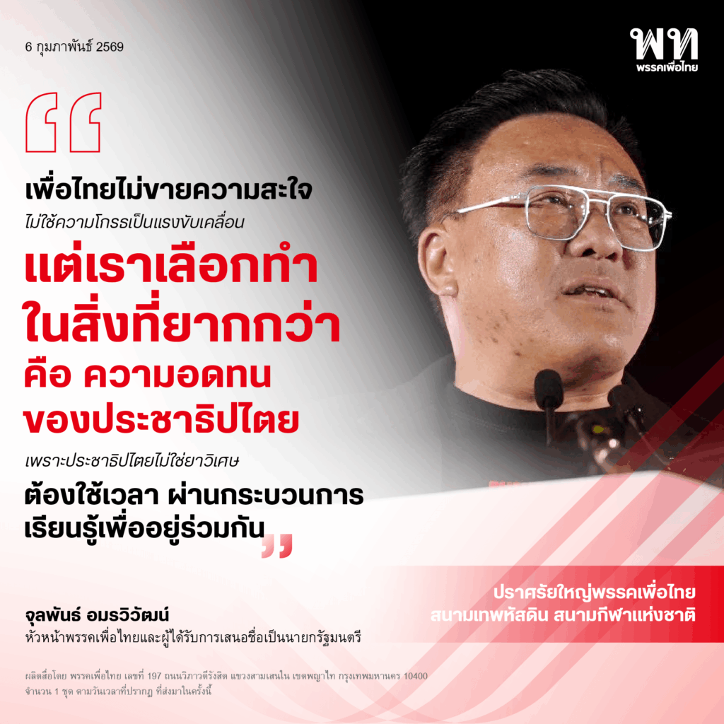 ประชาธิปไตย ต้องเริ่มจากการยอมรับความจริงข้อนี้ ไม่ใช่เหยียบหัวคนส่วนใหญ่ แล้วเรียกตัวเองว่าก้าวหน้า เพื่อไทยไม่ขายความสะใจ ไม่เหยียบคนอื่นเพื่อให้ตัวเองดูดี ไม่ใช้ความโกรธเป็นแรงขับเคลื่อน แต่เราเลือกทำในสิ่งที่ยากกว่า คือ ความอดทนของประชาธิปไตย เพราะประชาธิปไตยไม่ใช่ยาวิเศษ ต้องใช้เวลา ต้องผ่านกระบวนการเรียนรู้เพื่ออยู่ร่วมกัน