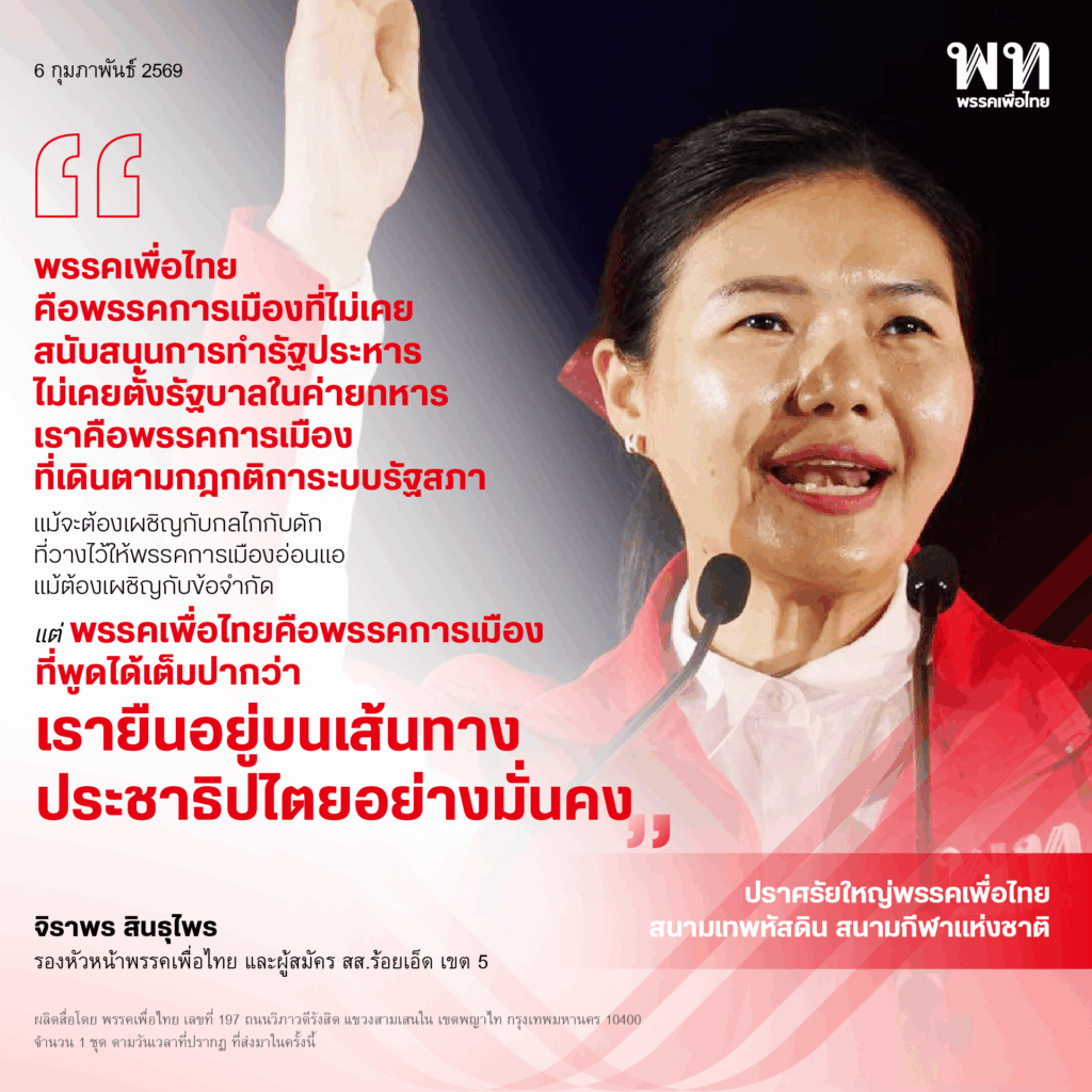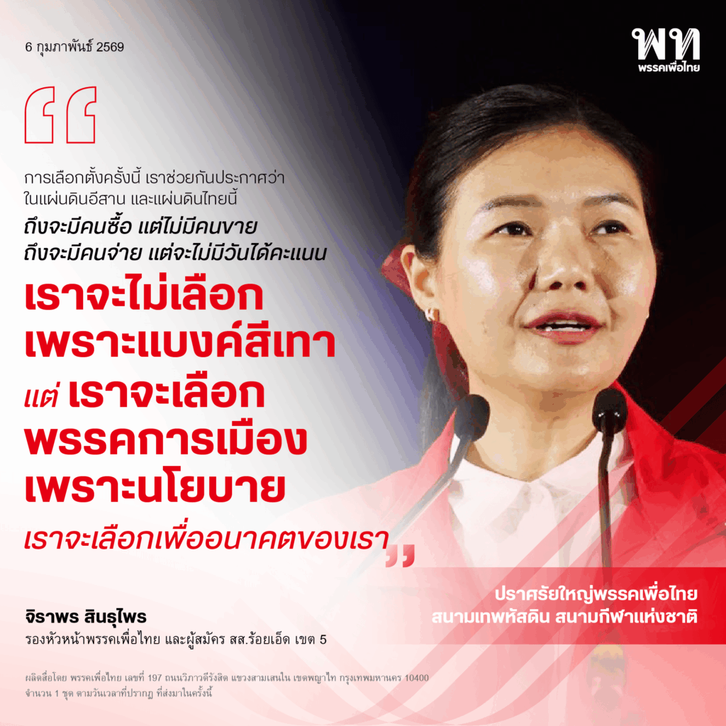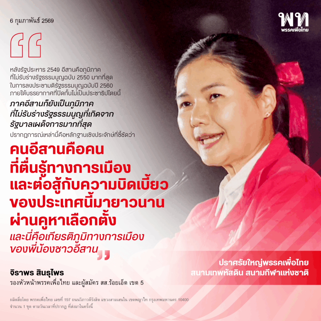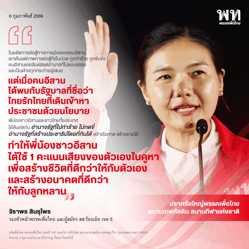 วันที่ 6 กุมภาพันธ์ 2569 ที่สนามเทพหัสดิน เขตปทุมวัน กรุงเทพฯ น.ส.จิราพร สินธุไพร รองหัวหน้าพรรคเพื่อไทย และผู้สมัคร สส.ร้อยเอ็ด เขต 5 กล่าวบนเวทีปราศรัยใหญ่พรรคเพื่อไทย “ยศชนันทำได้ เพื่อไทยทำได้ ประเทศไทยทำได้” ว่า ในฐานะผู้สมัคร สส.ลูกอีสาน ที่ได้มีโอกาสมายืนอยู่บนเวทีกลางเมืองหลวงซึ่งเป็นการรวมพลังผู้สนับสนุนพรรคเพื่อไทยในวันนี้ ต้องเรียนว่าภาคอีสาน ที่หลายคนมีภาพจำว่าแร้นแค้น เป็นพื้นที่ที่สร้างนักสู้เพื่อประชาธิปไตยจากรุ่นสู่รุ่น ในอดีตแผ่นดินที่ราบสูงแห่งนี้ ได้เคยมีนักสู้เพื่อประชาธิปไตยที่หลายคนเรียกขานว่า 4 รัฐมนตรีอีสาน