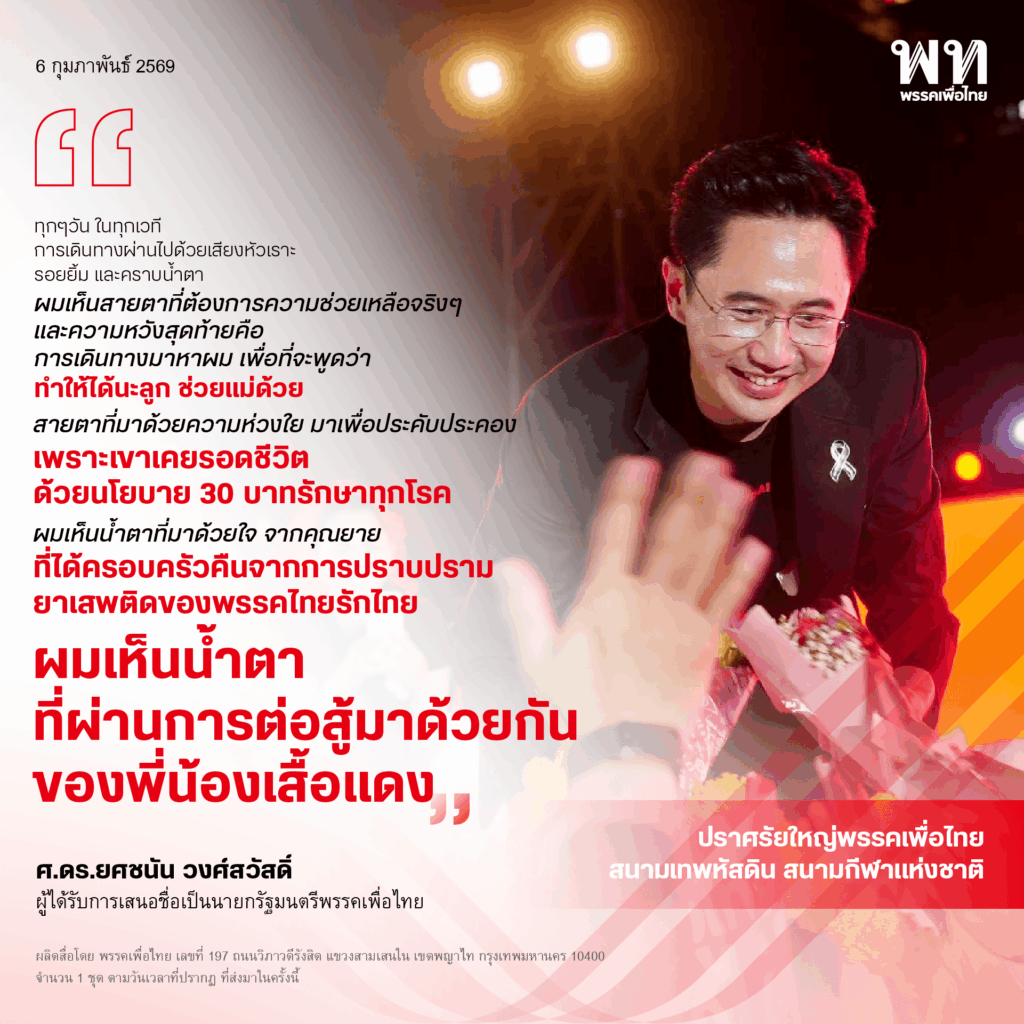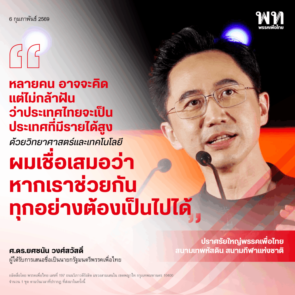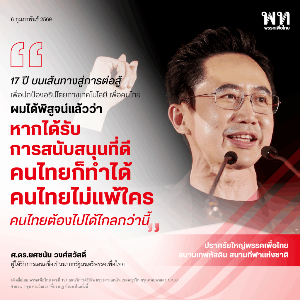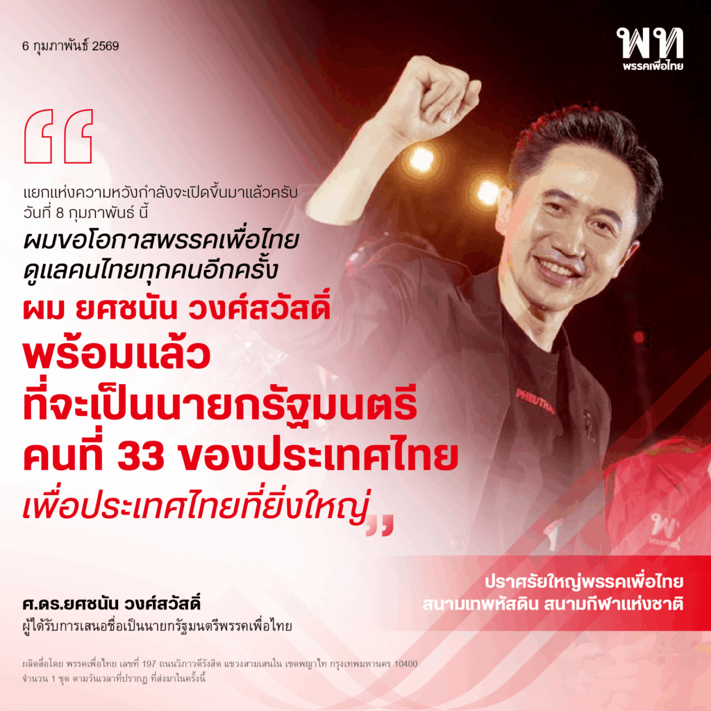 6 ก.พ. 2569 ที่สนามเทพหัสดิน สนามกีฬาแห่งชาติ กรุงเทพฯ ศ.ดร.ยศชนัน วงศ์สวัสดิ์ ผู้ได้รับการเสนอชื่อเป็นนายกรัฐมนตรีของพรรคเพื่อไทย ขึ้นเวทีปราศรัยใหญ่ ประกาศความพร้อมเป็นนายกรัฐมนตรีคนที่ 33 ของประเทศไทย พร้อมขอโอกาสจากประชาชนในการเลือกตั้งวันที่ 8 กุมภาพันธ์นี้ เพื่อ “เปิดแยกแห่งความหวัง” และเปลี่ยนความฝันของคนไทยให้เป็นความจริง