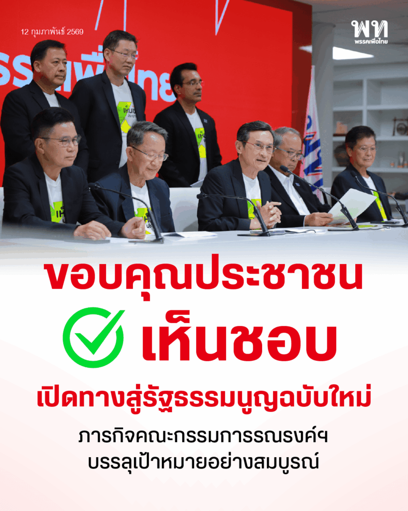 วันที่ 12 กุมภาพันธ์ 2569 นายจาตุรนต์ ฉายแสง ประธานคณะกรรมการรณรงค์สื่อสารประชามติ และรัฐธรรมนูญฉบับประชาชน พรรคเพื่อไทย นายชูศักดิ์ ศิรินิล รองหัวหน้าพรรคเพื่อไทย และคณะ แถลงข่าวแสดงความยินดีและขอขอบคุณพี่น้องประชาชนชาวไทยที่ร่วมใช้สิทธิออกเสียงประชามติ จนทำให้ประชามติ “เห็นชอบ” การจัดทำรัฐธรรมนูญฉบับใหม่ โดยผลการออกเสียงประชามติอย่างไม่เป็นทางการ (นับคะแนนแล้ว 94% ณ เวลา 11.00 น. วันที่ 12 กุมภาพันธ์) พบว่า คะแนน “เห็นชอบ” 19.9 ล้านเสียง และคาดว่าเมื่อนับครบแล้วจะมีผู้เห็นชอบมากกว่า 20 ล้านเสียง