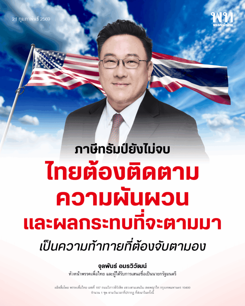 นายจุลพันธ์ อมรวิวัฒน์ หัวหน้าพรรคเพื่อไทย และผู้ได้รับการเสนอชื่อเป็นนายกรัฐมนตรี กล่าวถึงคำตัดสินศาลสูงสหรัฐฯ กรณีที่ทรัมป์นำกฎหมายฉบับอื่นขึ้นมาประกาศใช้ทันที โดยประกาศเก็บภาษี 10 เปอร์เซ็นต์เท่ากันทั่วโลก แม้ว่าจะดูเหมือนส่งผลดีกับการส่งออกของไทย แต่ในอีกมุมต้องมองว่าเรามีปัญหาหนี้ครัวเรือนสูง เพราะหากแก้ไขไม่ได้ เศรษฐกิจก็จะฟื้นไม่เต็มที่ จึงต้องติดตามสถานการณ์เรื่องภาษีสหรัฐฯ นี้ต่อไปอย่างใกล้ชิด โดยมีข้อความดังนี้