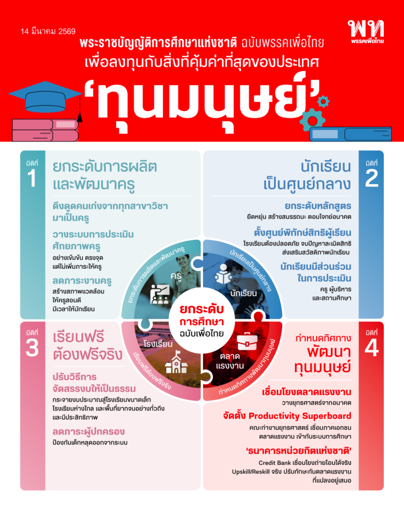 ในการแถลงข่าวพรรคเพื่อไทย(14 มีนาคม 2569) ในการเดินหน้าประเทศสู่ประเทศรายได้สูงผ่านการเสนอกฎหมายทั้ง 47 ฉบับ ในถ้อยแถลง ศ. ดร. ยศชนัน วงศ์สวัสดิ์ ได้แถลงเสนอร่างกฎหมายสำคัญอันจะเป็นหัวใจและรากฐานของการยกระดับประเทศ รวมถึงการเตรียมความพร้อมเพื่อรับมือกับวิกฤติระดับโลกที่กำลังเกิดขึ้น ประเทศไทยจำเป็นต้องมีการลงทุนใน ‘ทุนมนุษย์’ ซึ่งพรรคเพื่อไทยจะวางรากฐานด้วยการพลิกโฉมการศึกษา ด้วย ‘พระราชบัญญัติการศึกษาแห่งชาติ’
