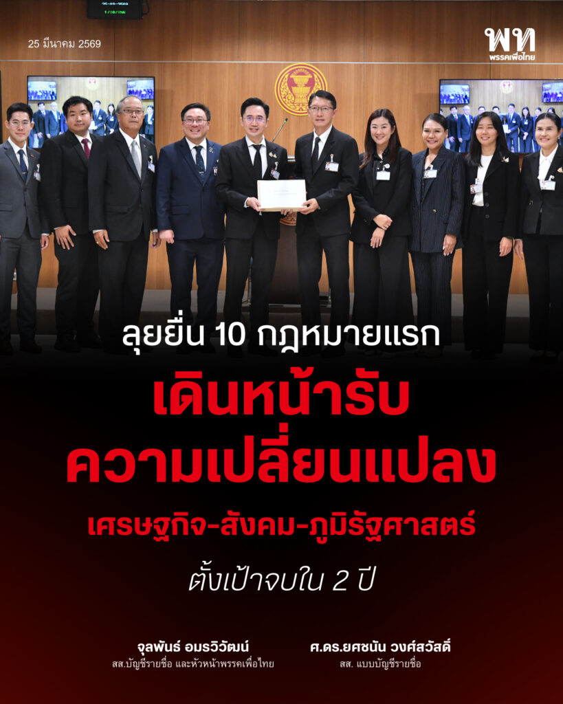 ‘เพื่อไทย’ ยื่นร่างกฎหมาย 10 ฉบับให้สภาฯ พร้อมรับมือสถานการณ์ที่เปลี่ยนแปลงไปทั้งสภาพเศรษฐกิจ – ภูมิรัฐศาสตร์ หวังทำให้แล้วเสร็จภายใน 2 ปี