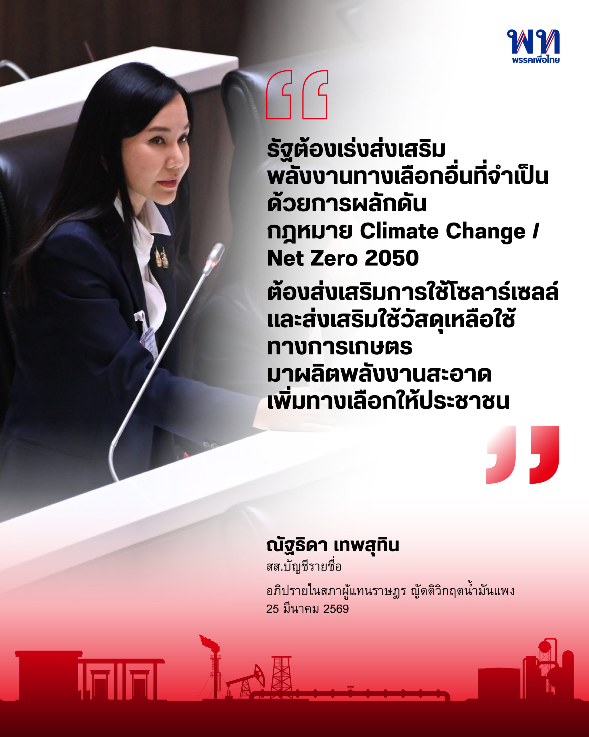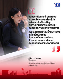 “รัฐต้องเร่งส่งเสริมพลังงานทางเลือกอื่นที่จำเป็น ด้วยการผลักดันกฎหมาย Climate Change / Net Zero 2050 ต้องส่งเสริมการใช้โซลาร์เซลล์ และส่งเสริมใช้วัสดุเหลือใช้ทางการเกษตรมาผลิตพลังงานสะอาดเพิ่มทางเลือกให้ประชาชน”