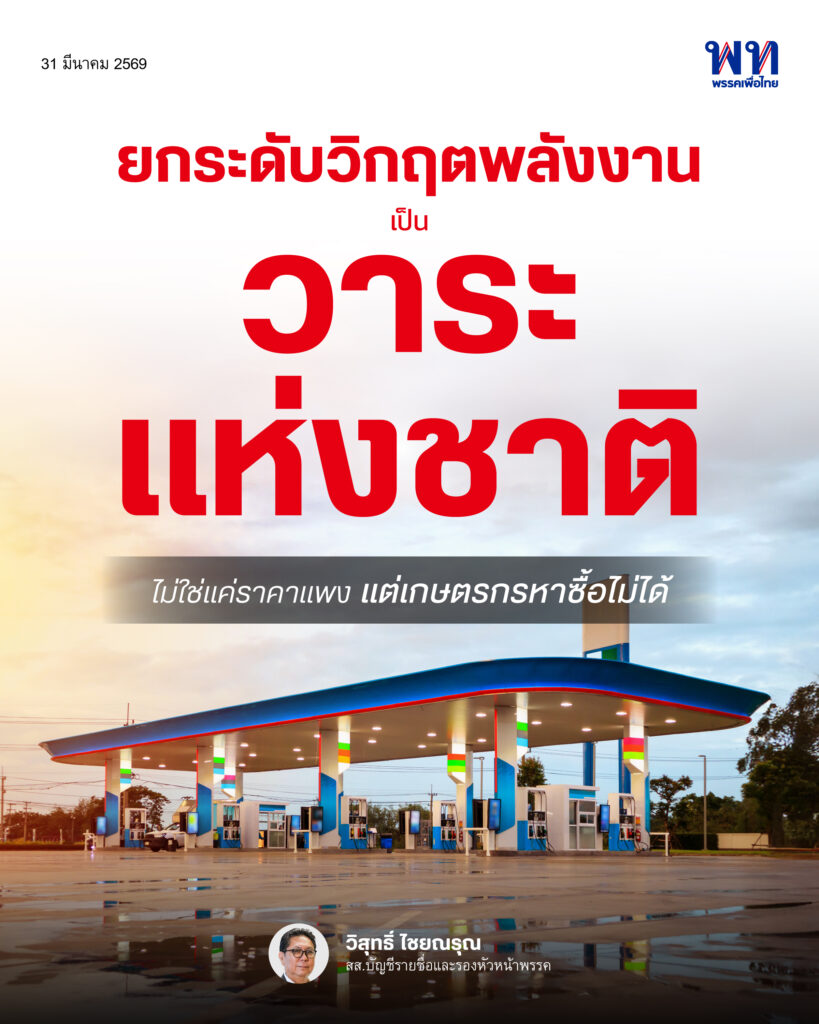 วันที่ 31 มีนาคม 2569 นายวิสุทธิ์ ไชยณรุณ สส.บัญชีรายชื่อและในฐานะรองหัวหน้าพรรคเพื่อไทย เปิดเผยว่า จากสถานการณ์ที่ราคาน้ำมันปรับราคาสูงขึ้น แม้จะมีราคาแพงแต่ผลที่ออกมาน้ำมันหายากมาก บางพื้นที่ไม่มีน้ำมัน หรือมีก็จำนวนไม่เพียงพอกับความต้องการของประชาชน นอกจากนี้น้ำมันยังคงเป็นปัจจัยสำคัญของการทำการเกษตรในปัจจุบัน หากไม่มีน้ำมันจะกระทบกับพี่น้องเกษตรกรโดยตรง บางพื้นที่เกษตรกรไม่มีน้ำมันเติมรถไถหรือเครื่องสูบน้ำที่จะสูบน้ำเข้าพื้นที่การเกษตร ดังนั้นหน่วยงานที่เกี่ยวข้องต้องเร่งจัดหาน้ำมันให้เพียงพอความต้องการของประชาชน เมื่อรัฐยืนยันว่าน้ำมันไม่ขาดแคลนแต่ทำไมหาซื้อไม่ได้