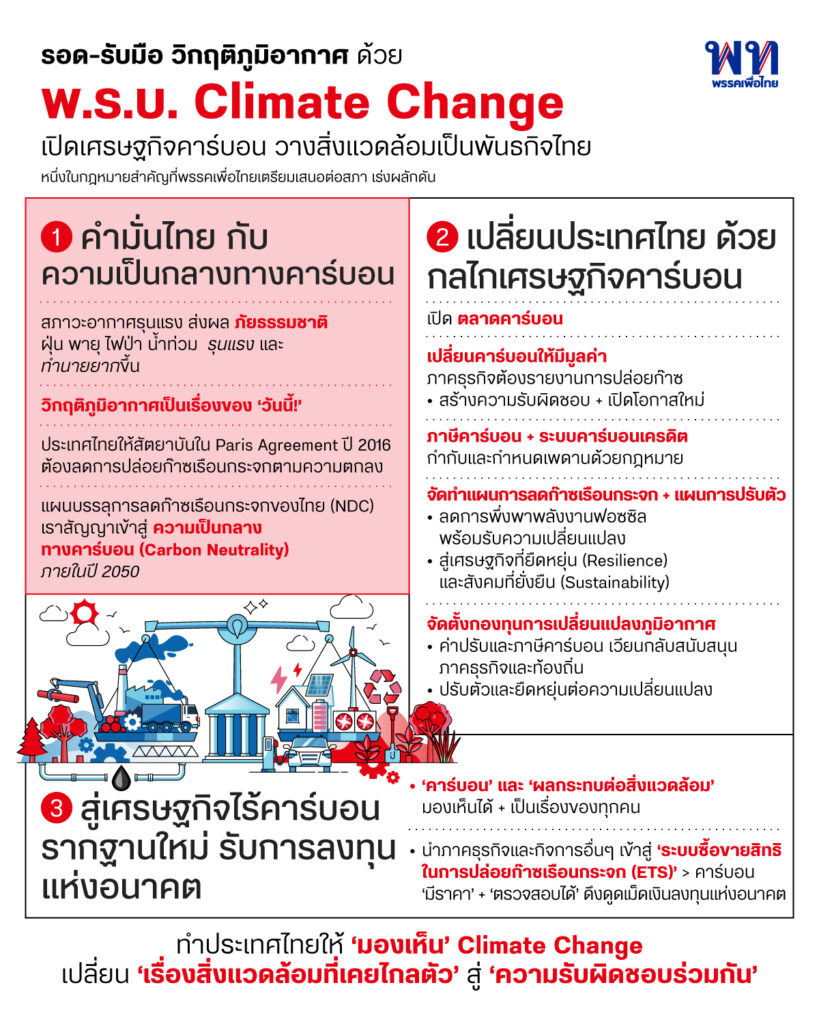 พรรคเพื่อไทยจึงเสนอ พ.ร.บ.การเปลี่ยนแปลงสภาพภูมิอากาศ หรือ พ.ร.บ. Climate Change กฎหมายที่ไม่เป็นเพียงกฎหมายสิ่งแวดล้อม แต่เป็นกฎหมายที่วางกติกาเศรษฐกิจของประเทศโดยนำเอาความรับผิดชอบและต้นทุนทางสิ่งแวดล้อม คือการปล่อยก๊าซเรือนกระจก ให้กลายเป็นต้นทุนที่ต้องนำมาคิดคำนวณ เป็นสิ่งที่มีมูลค่า และเราทุกคนต้องรับผิดชอบร่วมกัน