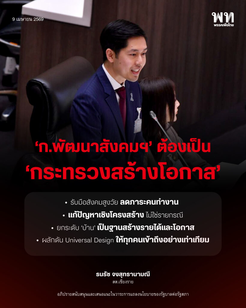 นายธนรัช จงสุทธานามณี สส.เชียงราย พรรคเพื่อไทย อภิปรายสนับสนุนและเสนอแนะการแถลงนโยบายของรัฐบาลต่อรัฐสภา ในส่วนของกระทรวงการพัฒนาสังคมและความมั่นคงของมนุษย์ (พม.) โดยเสนอให้ยกระดับบทบาทจาก “กระทรวงสงเคราะห์” ไปสู่ “กระทรวงสร้างโอกาส” ที่มุ่งพัฒนาศักยภาพประชาชนให้สามารถยืนได้ด้วยตนเองอย่างมีศักดิ์ศรี