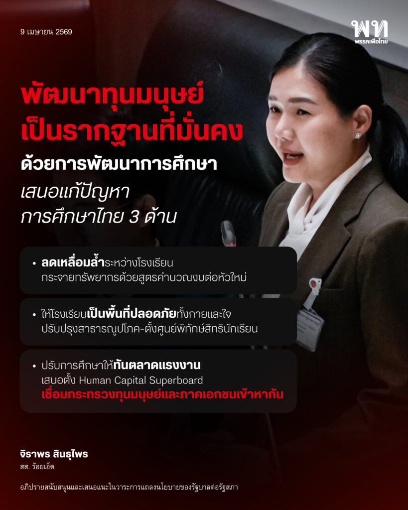 ‘จิราพร’ เปิดแนวทางแก้ปัญหาการศึกษาไทย มุ่งพัฒนาทุนมนุษย์เป็นรากฐานประเทศ แนะแก้ 3 ด้าน ลดเหลื่อมล้ำด้วยสูตรคำนวณงบใหม่ โรงเรียนเป็นพื้นที่ปลอดภัย เชื่อมตลาดแรงงาน