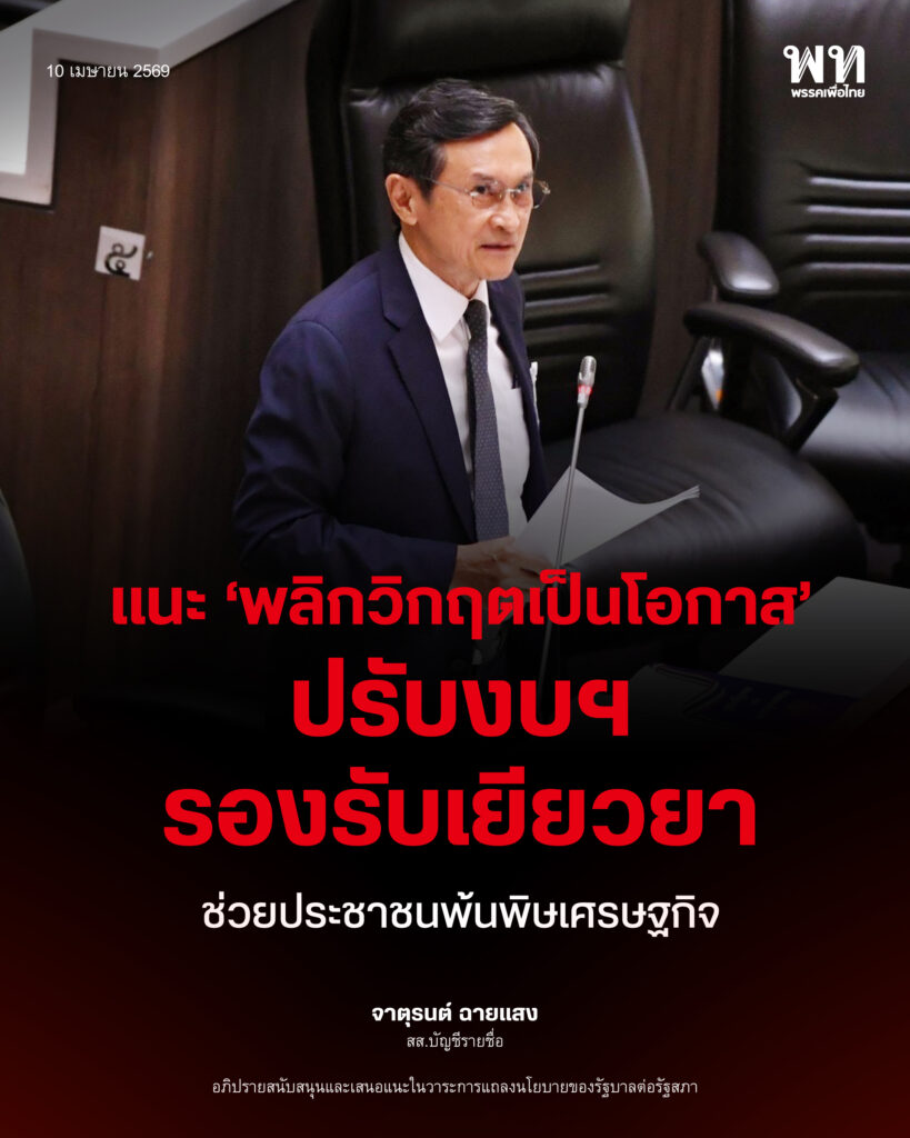 ทั้งนี้ นายจาตุรนต์ ฉายแสง ตั้งคำถามสำคัญถึงนายกรัฐมนตรีเกี่ยวกับข้อจำกัดด้านงบประมาณ โดยเสนอให้คณะรัฐมนตรีเร่งปรับแผนการใช้งบประมาณปีปัจจุบันภายในช่วงเวลาที่เหลือ และแก้ไขกฎหมายงบประมาณปีถัดไป เพื่อจัดสรรงบไปยังมาตรการเร่งด่วน โดยเฉพาะการเยียวยาประชาชนที่ได้รับผลกระทบจากวิกฤตเศรษฐกิจ พร้อมย้ำว่า หากไม่เร่งปรับนโยบายและโครงสร้างอย่างจริงจัง ประเทศอาจเผชิญข้อจำกัดในการแก้ปัญหาในระยะยาวมากยิ่งขึ้น