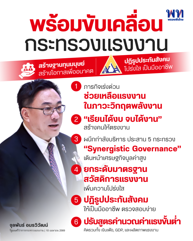 เปิดพิมพ์เขียว “จุลพันธ์” ปฏิรูปกองทุนประกันสังคม เน้นโปร่งใส-เป็นธรรม-มืออาชีพ พร้อมนำร่อง ‘เรียนได้งบ จบได้งาน’ ปั้นทักษะแรงงานตรงโจทย์ตลาด ลั่นไม่นิ่งเฉยคอร์รัปชัน ย้ำผนึกกำลัง 5 กระทรวงหลัก ขยับไทยสู่เศรษฐกิจมูลค่าสูง
