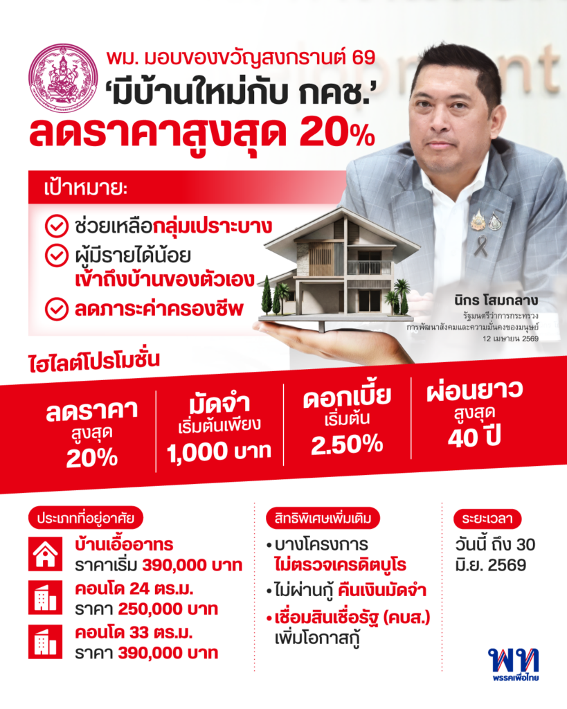 “นิกร” รมว.พม. มอบของขวัญสงกรานต์ 69 ช่วยกลุ่มเปราะบาง-ผู้มีรายได้น้อย ให้มีบ้านใหม่ง่ายขึ้น ลดราคาสูงสุด 20% – ดอกเบี้ยเริ่มต้น 2.50% – ผ่อนยาวถึง 40 ปี