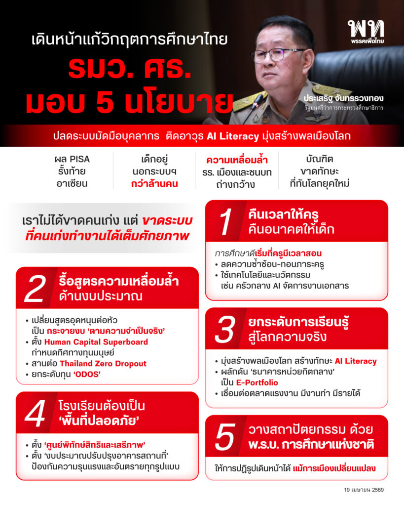 เปลี่ยนการสอนแบบท่องจำ สู่ ‘หลักสูตรฐานสมรรถนะ’ และดันนโยบาย ‘AI for All’ เตรียมความพร้อมเด็กไทยสู่การประเมิน PISA 2029 ที่จะเพิ่มมิติ AI Literacy เข้ามา พร้อมจับมือรองนายกฯ ยศชนัน บูรณาการข้ามกระทรวง (ศธ., อว., แรงงาน, พม. และเอกชน) ตั้ง Human Capital Superboard กำหนดทิศทางทุนมนุษย์ของประเทศ และผุด ‘ธนาคารหน่วยกิตกลาง’ (Credit Bank) รวมถึงระบบ E-Portfolio เพื่อให้การเรียนรู้ไร้รอยต่อ ยืดหยุ่น และตอบโจทย์สังคมปัจจุบัน พร้อมความร่วมมือกับองค์กรระดับโลก (OECD, UN) เพื่อยกระดับเด็กไทยสู่ Global Citizen