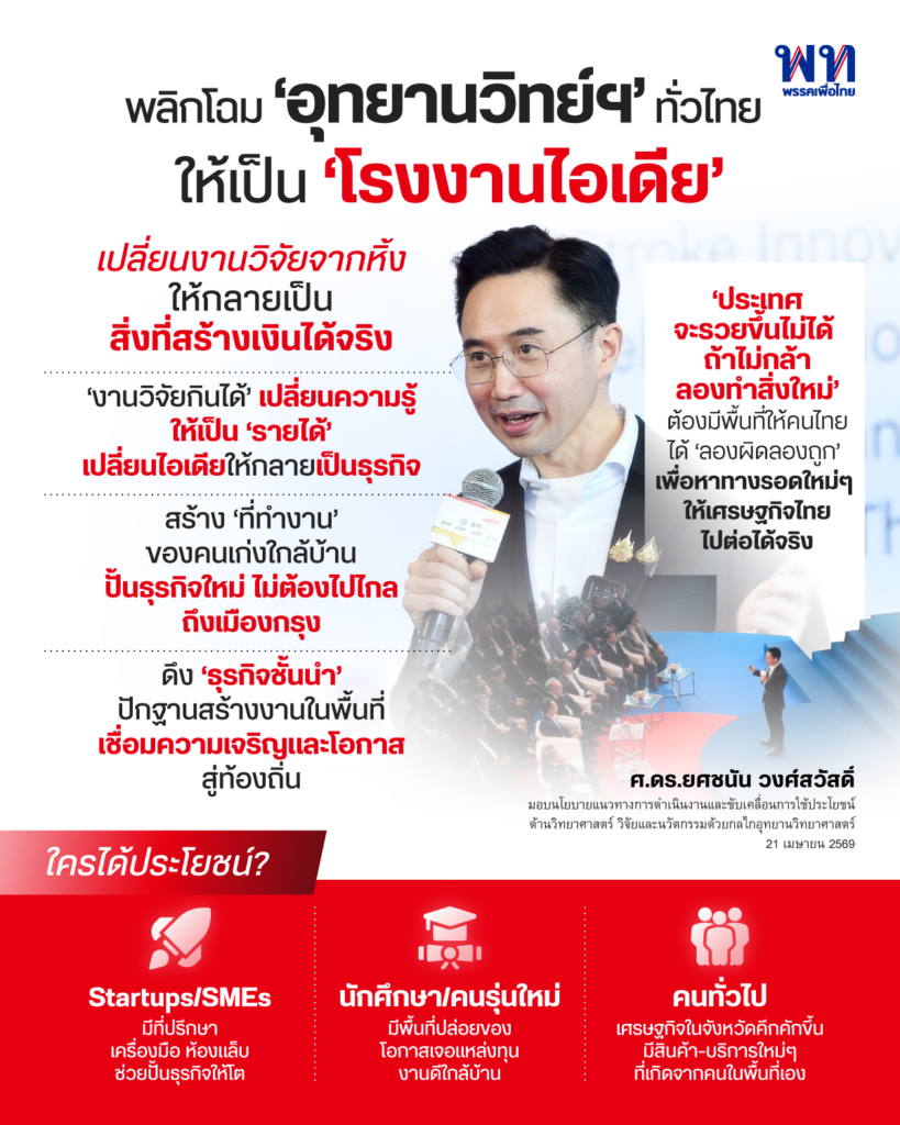 “งานวิจัยกินได้” เปลี่ยนความรู้เป็นรายได้ – เร่งผลักดันงานวิจัยและนวัตกรรมจากห้องแล็บ (Deep Tech) ให้ออกสู่ตลาดจริง เพื่อสร้างมูลค่าเพิ่มให้กับสินค้าและบริการของคนไทย