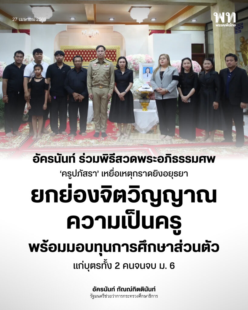อัครนันท์ ร่วมพิธีสวดพระอภิธรรมศพ ‘ครูปภัสรา’ เหยื่อเหตุกราดยิงอยุธยา ยกย่องจิตวิญญาณความเป็นครู พร้อมมอบทุนการศึกษาส่วนตัว แก่บุตรทั้ง 2 คนจนจบ ม.6