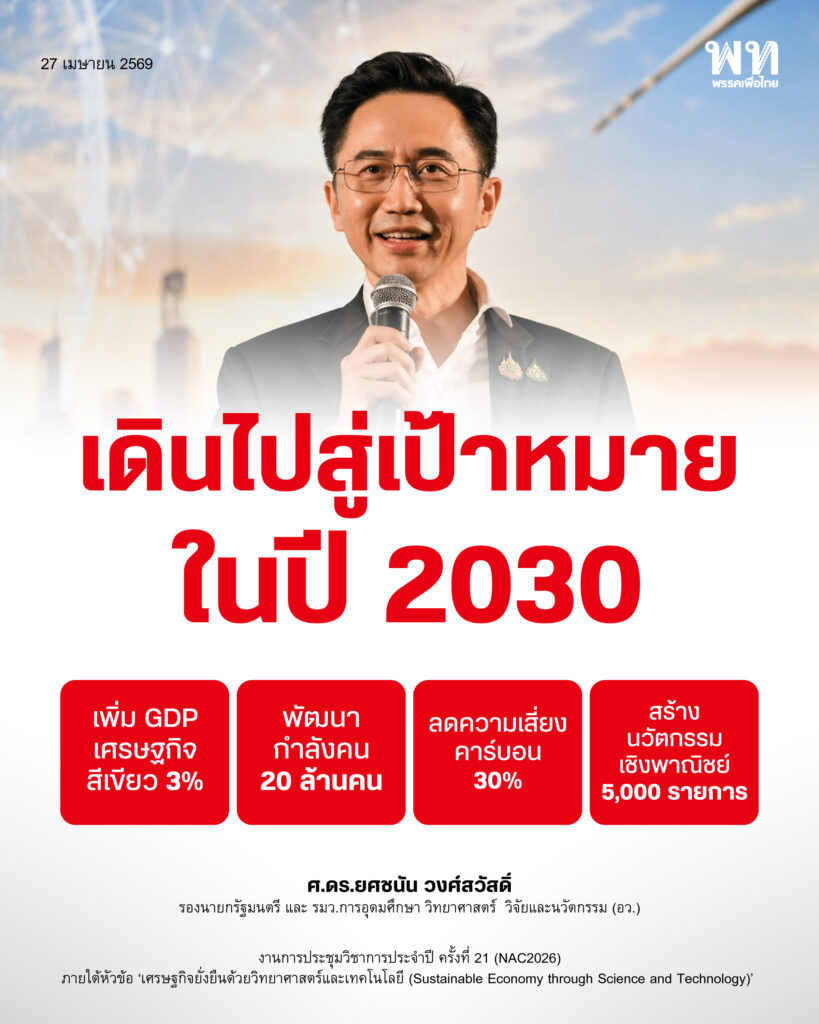 เมื่อวันที่ 27 เม.ย. 2569 ศ.ดร.ยศชนัน วงศ์สวัสดิ์ รองนายกรัฐมนตรีและรัฐมนตรีว่าการกระทรวงการอุดมศึกษา วิทยาศาสตร์ วิจัยและนวัตกรรม (อว.) เป็นวิทยากรร่วมเสวนาในหัวข้อสัมมนา “Net Zero: Beyond the Environment Shaping Lives and Economies: เปลี่ยนวิถีชีวิตพลิกเกมเศรษฐกิจด้วย Net Zero” ภายในงานการประชุมวิชาการประจำปี ครั้งที่ 21 (NAC2026) ภายใต้หัวข้อ “เศรษฐกิจยั่งยืนด้วยวิทยาศาสตร์และเทคโนโลยี (Sustainable Economy through Science and Technology)” โดยมี ศ.ดร.ศุภชัย ปทุมนากุล ปลัดกระทรวง อว. ดนุพร ปุณณกันต์ ทพญ.ศรีญาดา ปาลิมาพันธ์ ที่ปรึกษา รมว.อว. นายฉัตริน จันทร์หอม เลขานุการ รมว.อว. ศ.ดร. ชูกิจ ลิมปิจํานงค์ ผู้อํานวยการสํานักงานพัฒนาวิทยาศาสตร์และเทคโนโลยีแห่งชาติ (สวทช.) ตลอดจนคณะผู้บริหาร เข้าร่วม ณ ห้องประชุมออดิทอเรียม อาคารศูนย์ประชุมอุทยานวิทยาศาสตร์ประเทศไทย ต.คลองหนึ่ง อ.คลองหลวง จ.ปทุมธานี