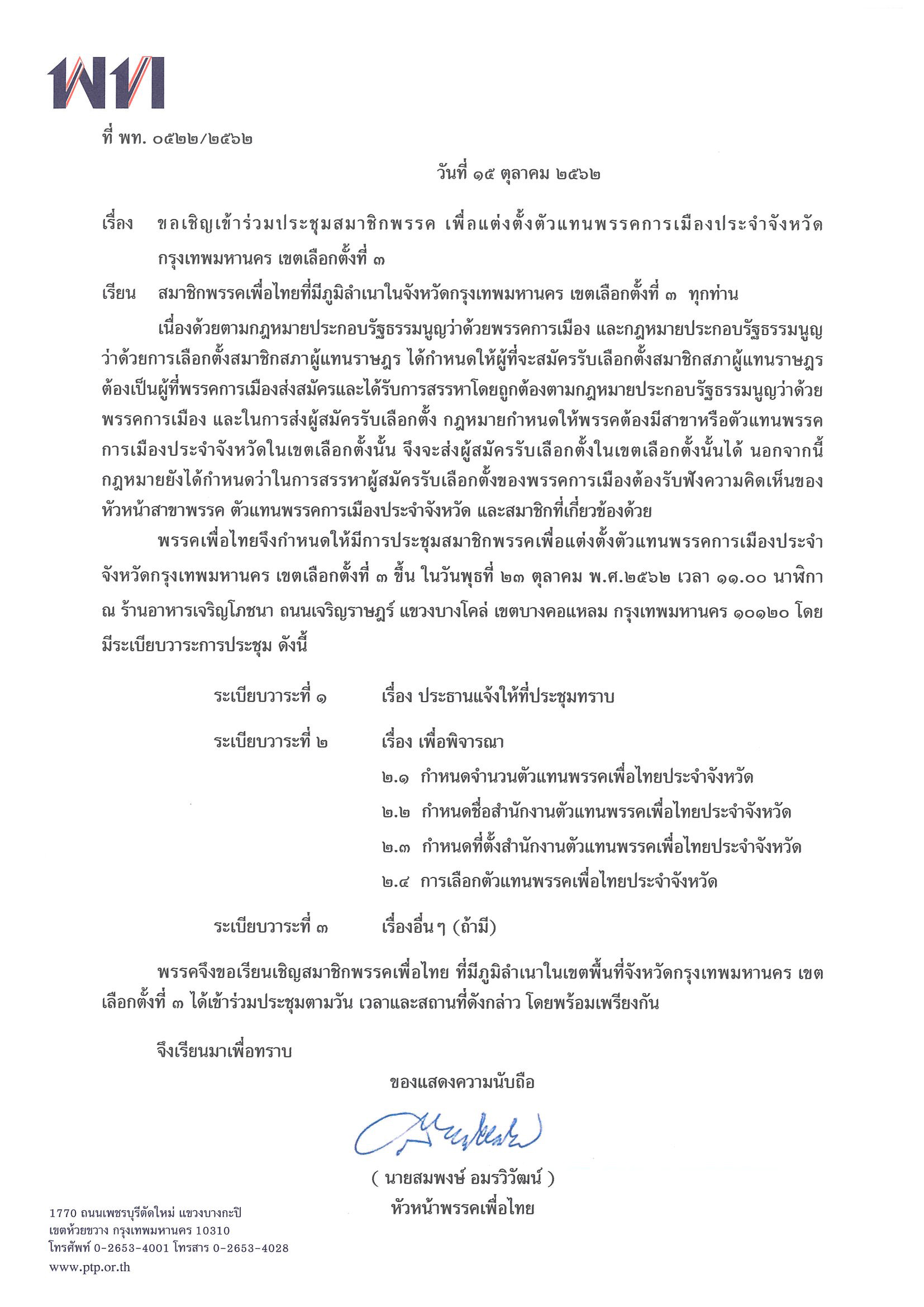 เชิญเข้าร่วมประชุมสมาชิกพรรค เพื่อแต่งตั้งตัวแทนพรรคประจำจังหวัดกรุงเทพมหานคร เขตเลือกตั้งที่ 3