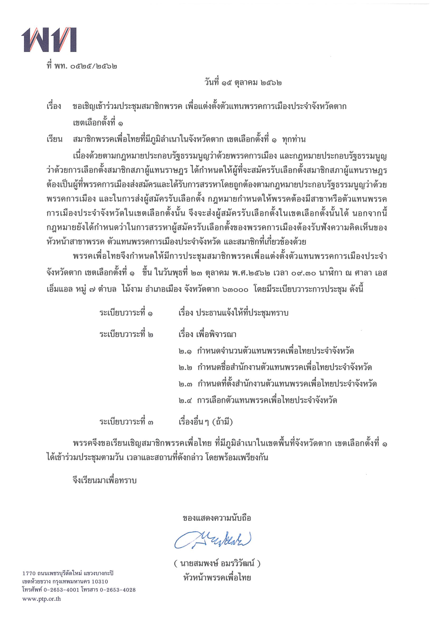 เชิญเข้าร่วมประชุมสมาชิกพรรค เพื่อแต่งตั้งตัวแทนพรรคประจำจังหวัดตาก เขตเลือกตั้งที่ 1
