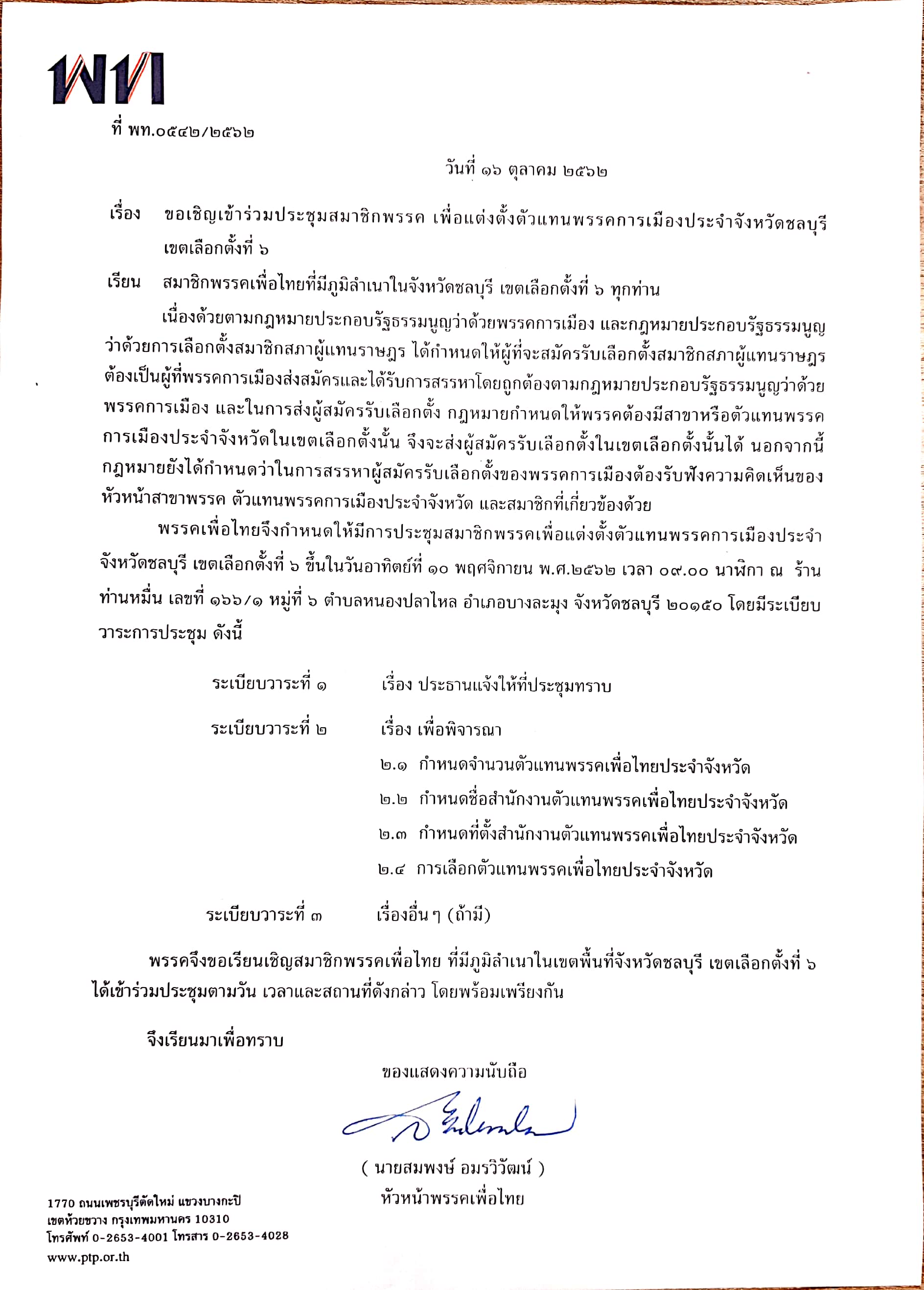 เชิญเข้าร่วมประชุมสมาชิกพรรคเพื่อแต่งตั้งตัวแทนพรรคประจำจังหวัดชลบุรี เขตเลือกตั้งที่ 6