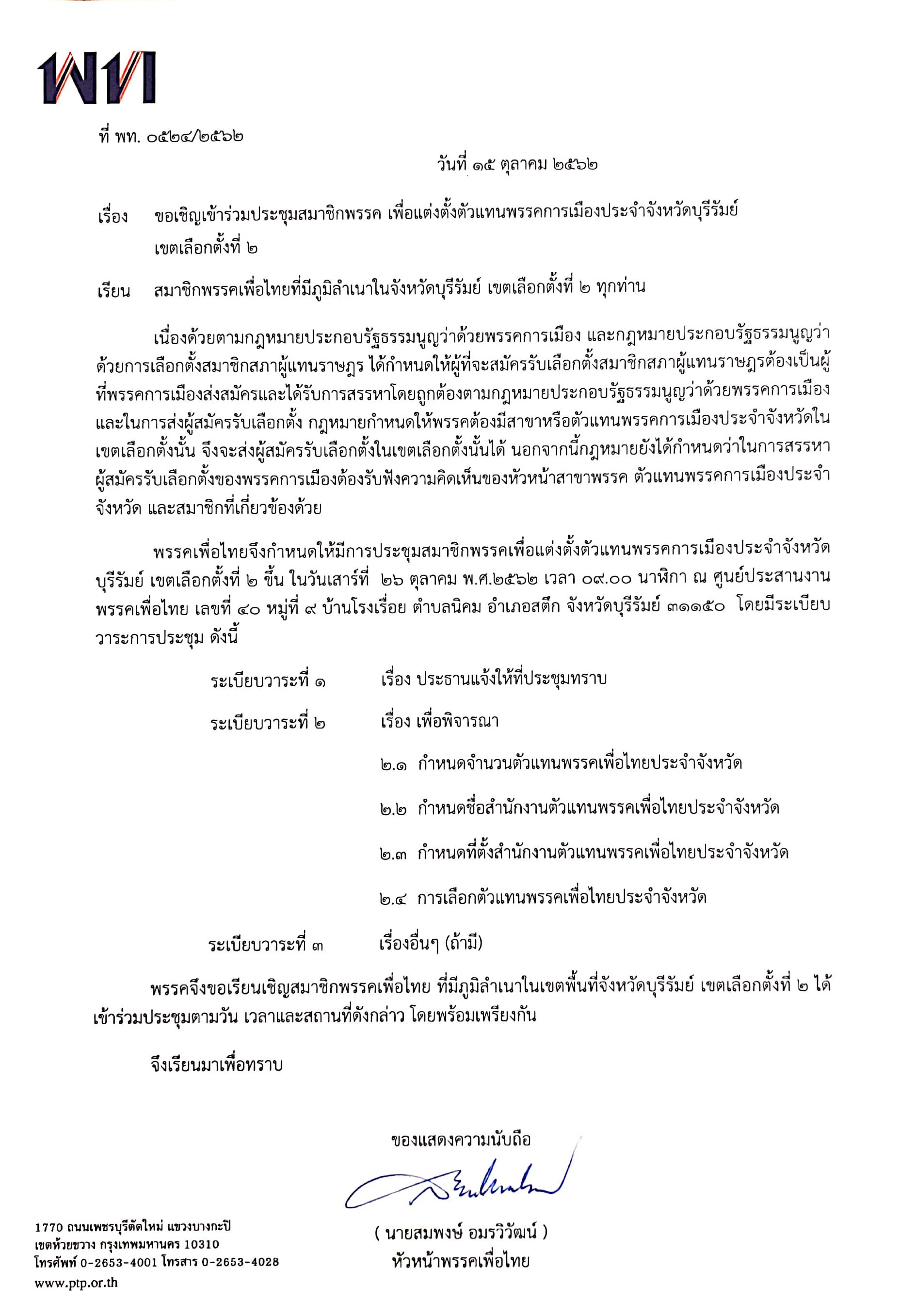 เชิญเข้าร่วมประชุมสมาชิกพรรคเพื่อแต่งตั้งตัวแทนพรรคประจำจังหวัดบุรีรัมย์ เขตเลือกตั้งที่ 2