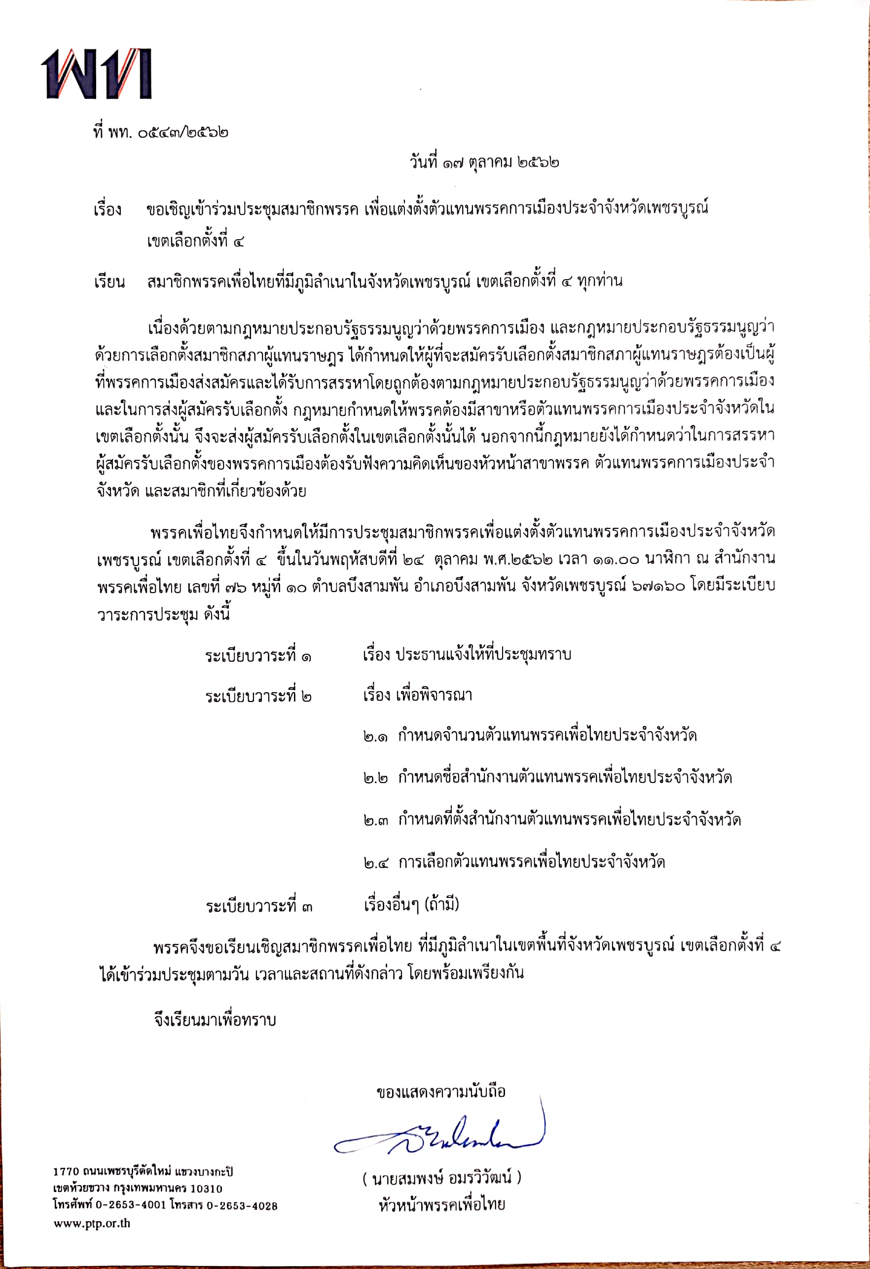 เชิญเข้าร่วมประชุมสมาชิกพรรคเพื่อแต่งตั้งตัวแทนพรรคประจำจังหวัดเพชรบูรณ์ เขตเลือกตั้งที่ 4