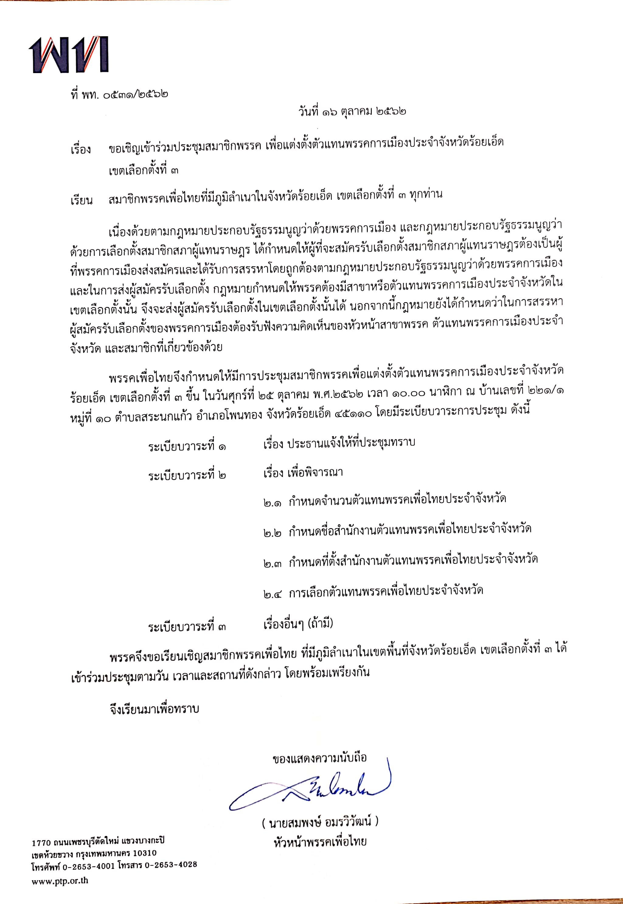 เชิญเข้าร่วมประชุมสมาชิกพรรคเพื่อแต่งตั้งตัวแทนพรรคประจำจังหวัดร้อยเอ็ด เขตเลือกตั้งที่ 3