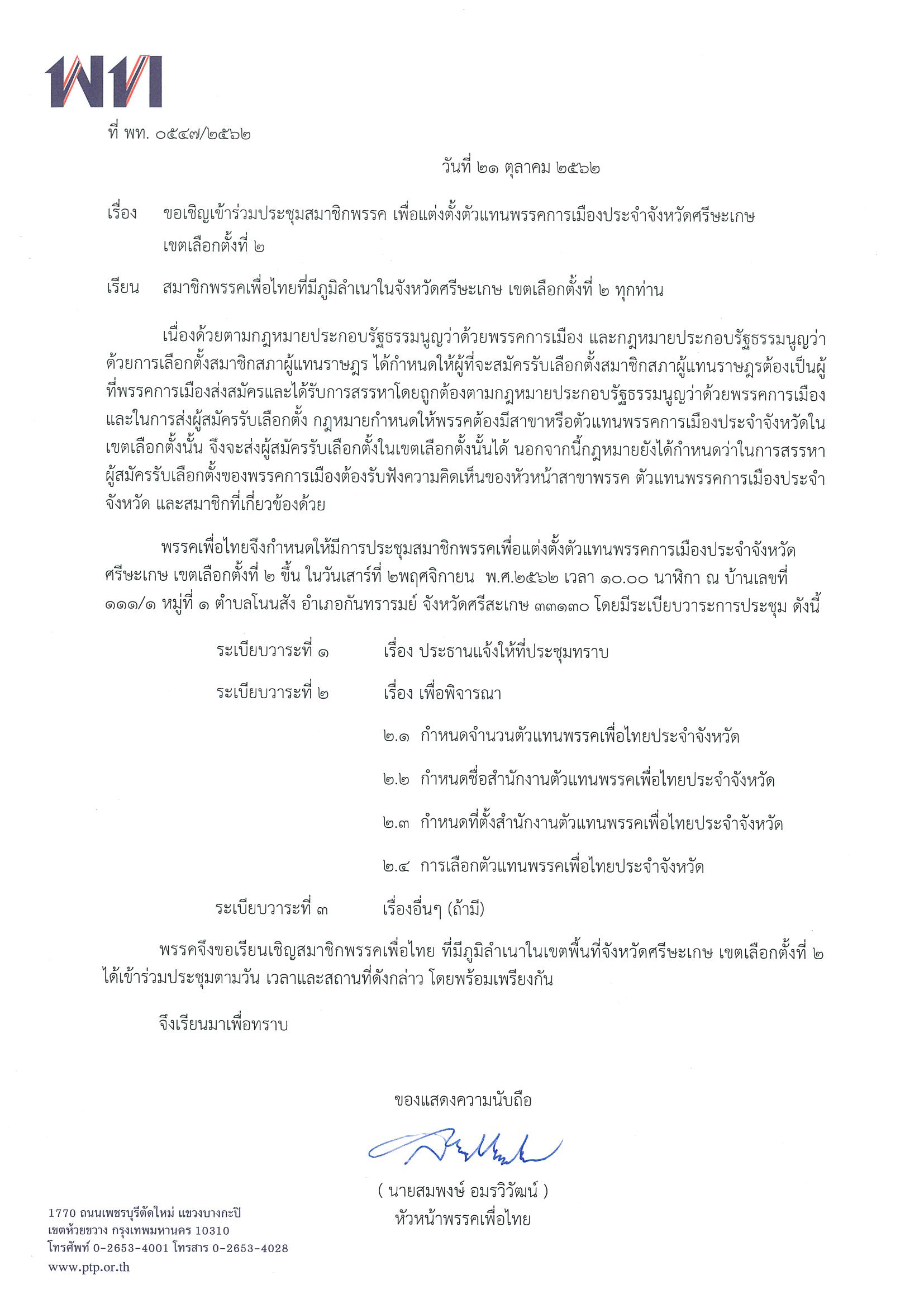 เชิญเข้าร่วมประชุมสมาชิกพรรคเพื่อแต่งตั้งตัวแทนพรรคประจำจังหวัดศรีสะเกษ เขตเลือกตั้งที่ 2