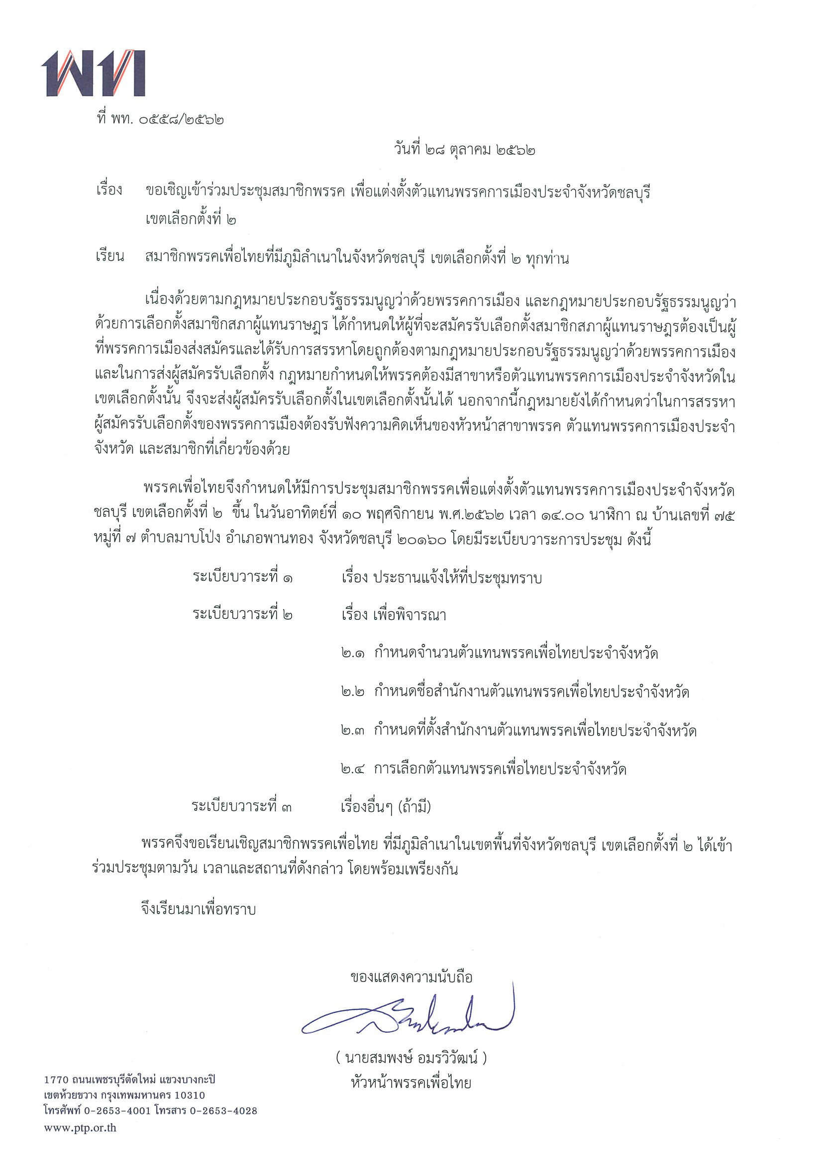 ขอเชิญเข้าร่วมประชุมสมาชิกพรรค เพื่อแต่งตั้งตัวแทนพรรคการเมืองประจำจังหวัดชลบุรี เขตเลือกตั้งที่ 2