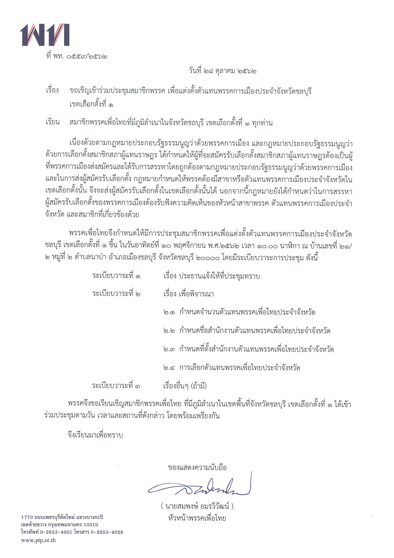 ขอเชิญเข้าร่วมประชุมสมาชิกพรรค เพื่อแต่งตั้งตัวแทนพรรคการเมืองประจำจังชลบุรี เขตเลือกตั้งที่ 1