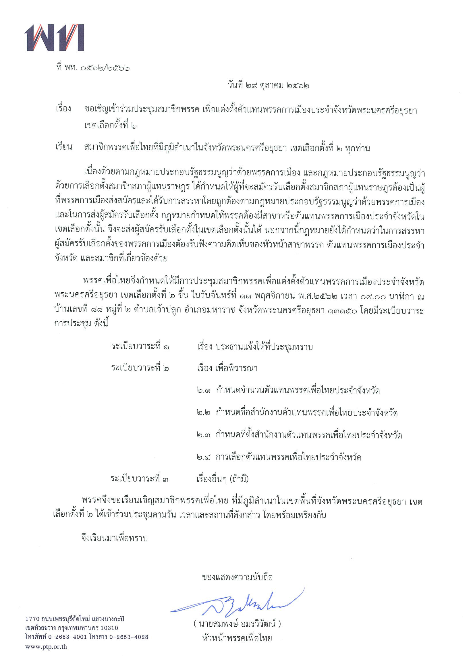 ขอเชิญเข้าร่วมประชุมสมาชิกพรรค เพื่อแต่งตั้งตัวแทนพรรคการเมืองประจำจังหวัดพระนครศรีอยุธยา เขตเลือกตั้งที่ 2