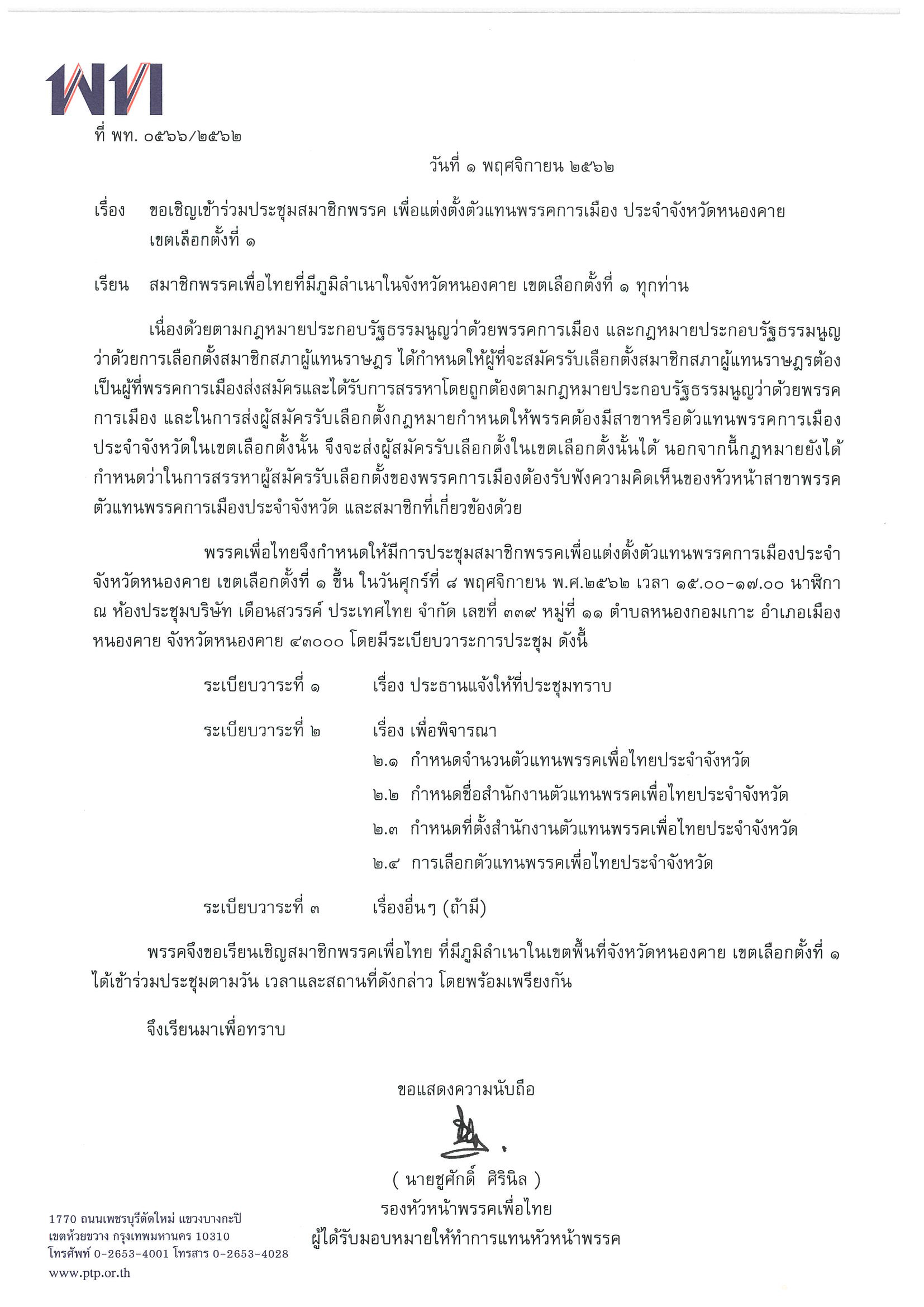 ขอเชิญเข้าร่วมประชุมสมาชิกพรรค เพื่อแต่งตั้งตัวแทนพรรคประจำจังหวัดหนองคาย เขตเลือกตั้งที่ 1