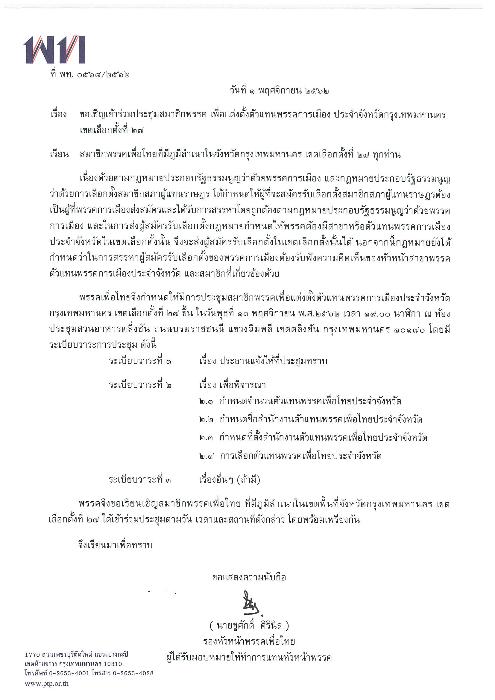 ขอเชิญเข้าร่วมประชุมสมาชิกพรรค เพื่อแต่งตั้งตัวแทนพรรคประจำจังหวัดกรุงเทพมหานคร เขตเลือกตั้งที่ 27