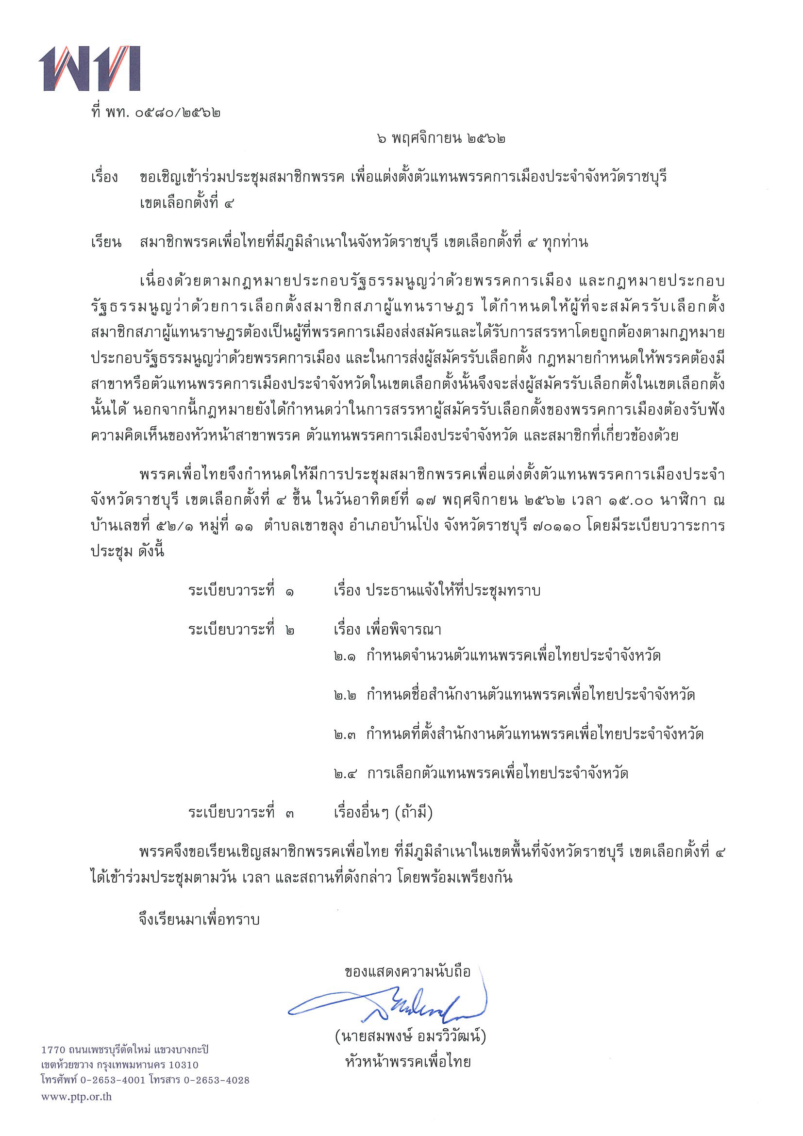ขอเชิญเข้าร่วมประชุมสมาชิกพรรค เพื่อแต่งตั้งตัวแทนพรรคประจำจังหวัดราชบุรี เขตเลือกตั้งที่ 4