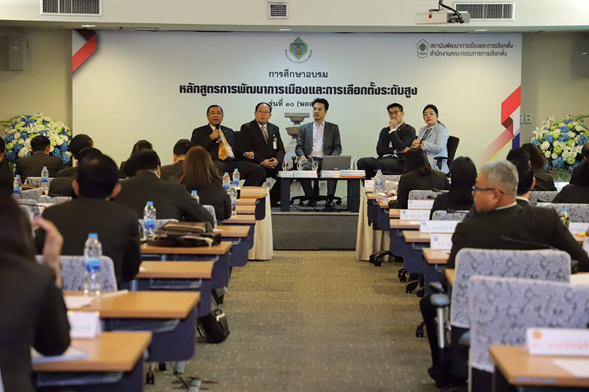 (21 พ.ย. 62) หลักสูตรการพัฒนาการเมืองและการเลือกตั้งระดับสูง โดย สถาบันพัฒนาการเมืองและการเลือกตั้ง คณะกรรมการการเลือกตั้ง (กกต.) จัดเสวนา “ผู้นำการเมืองกับอนาคตประเทศไทย” โดยมี คุณหญิงสุดารัตน์ เกยุราพันธุ์ ประธานยุทธศาสตร์พรรคเพื่อไทย นายธนาธร จึงรุ่งเรืองกิจ หัวหน้าพรรคอนาคตใหม่ นายวีระกร คำประกอบ ส.ส. พรรคพลังประชารัฐ นายปริญ พานิชภักดิ์ รองหัวหน้าพรรคประชาธิปัตย์ ร่วมเสวนา ดำเนินรายการโดย นายยุทธพร อิสระชัย