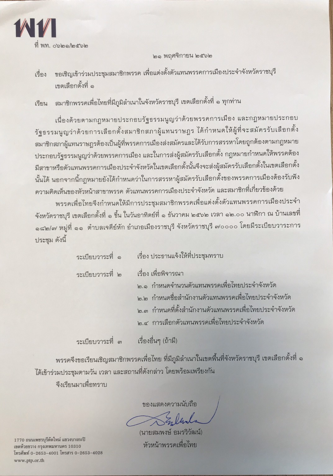 เชิญเข้าร่วมประชุมสมาชิกพรรค เพื่อแต่งตั้งตัวแทนพรรคประจำจังหวัดราชบุรี เขตเลือกตั้งที่ 1
