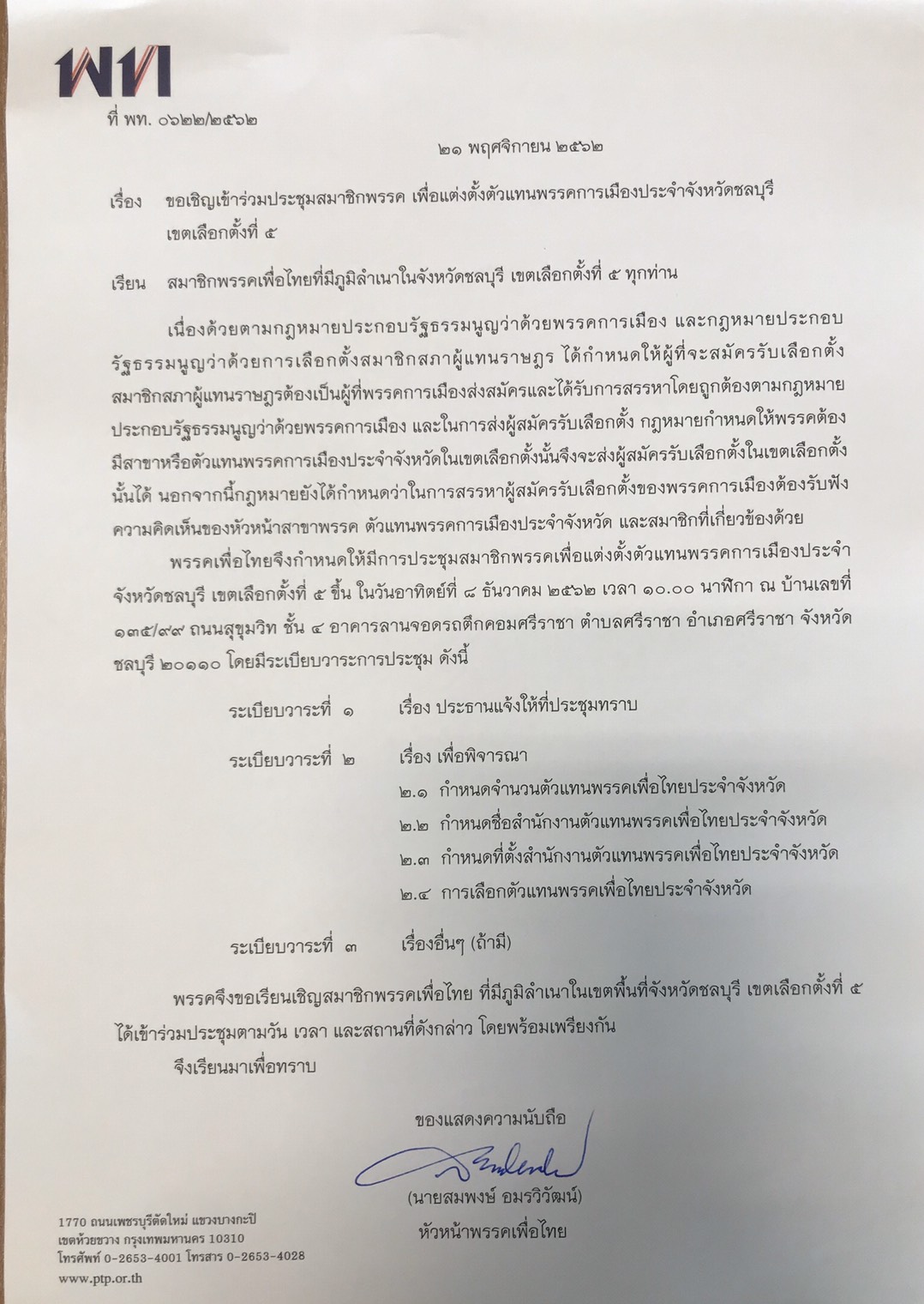 เชิญเข้าร่วมประชุมสมาชิกพรรค เพื่อแต่งตั้งตัวแทนพรรคประจำจังหวัดชลบุรี เขตเลือกตั้งที่ 5