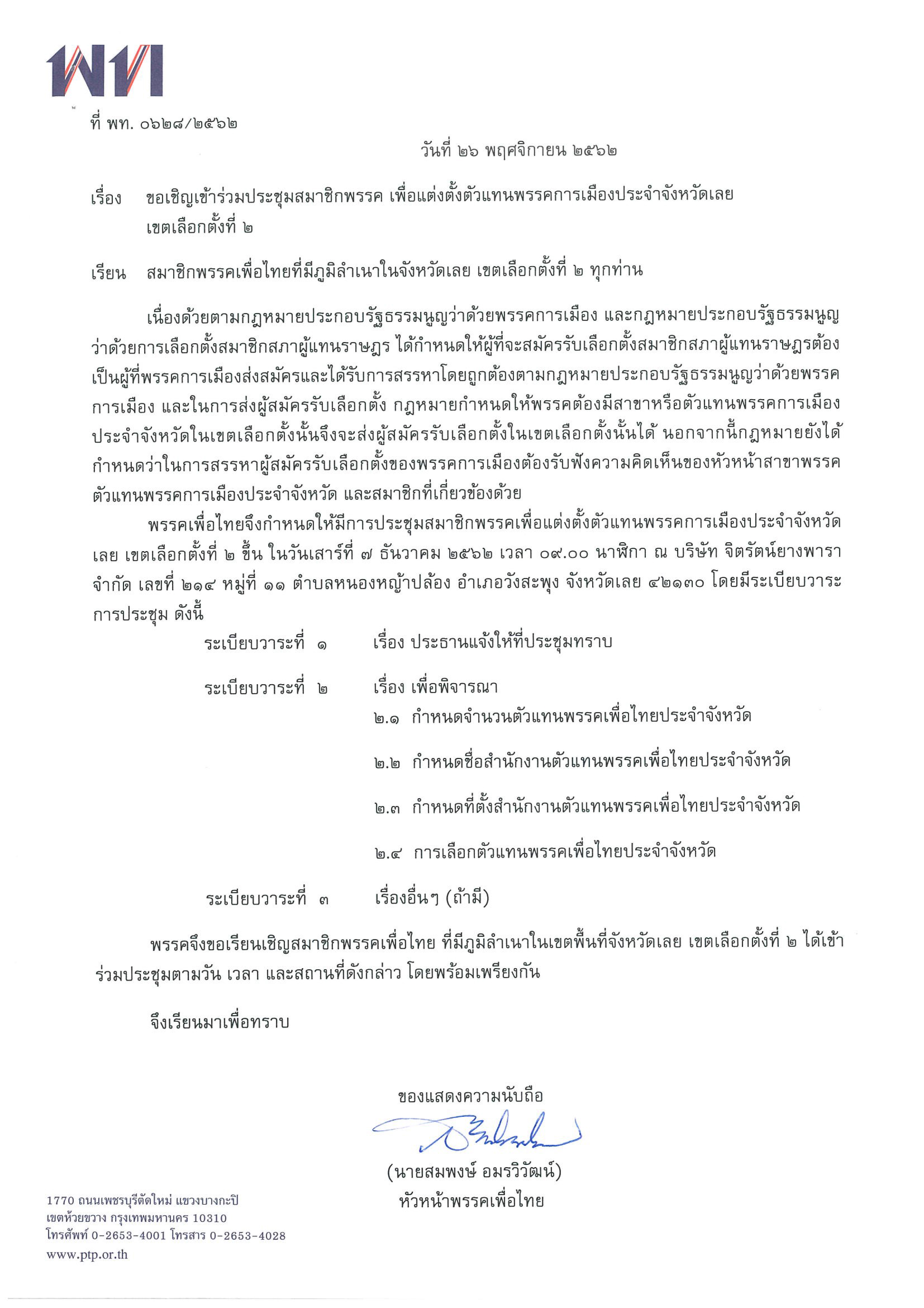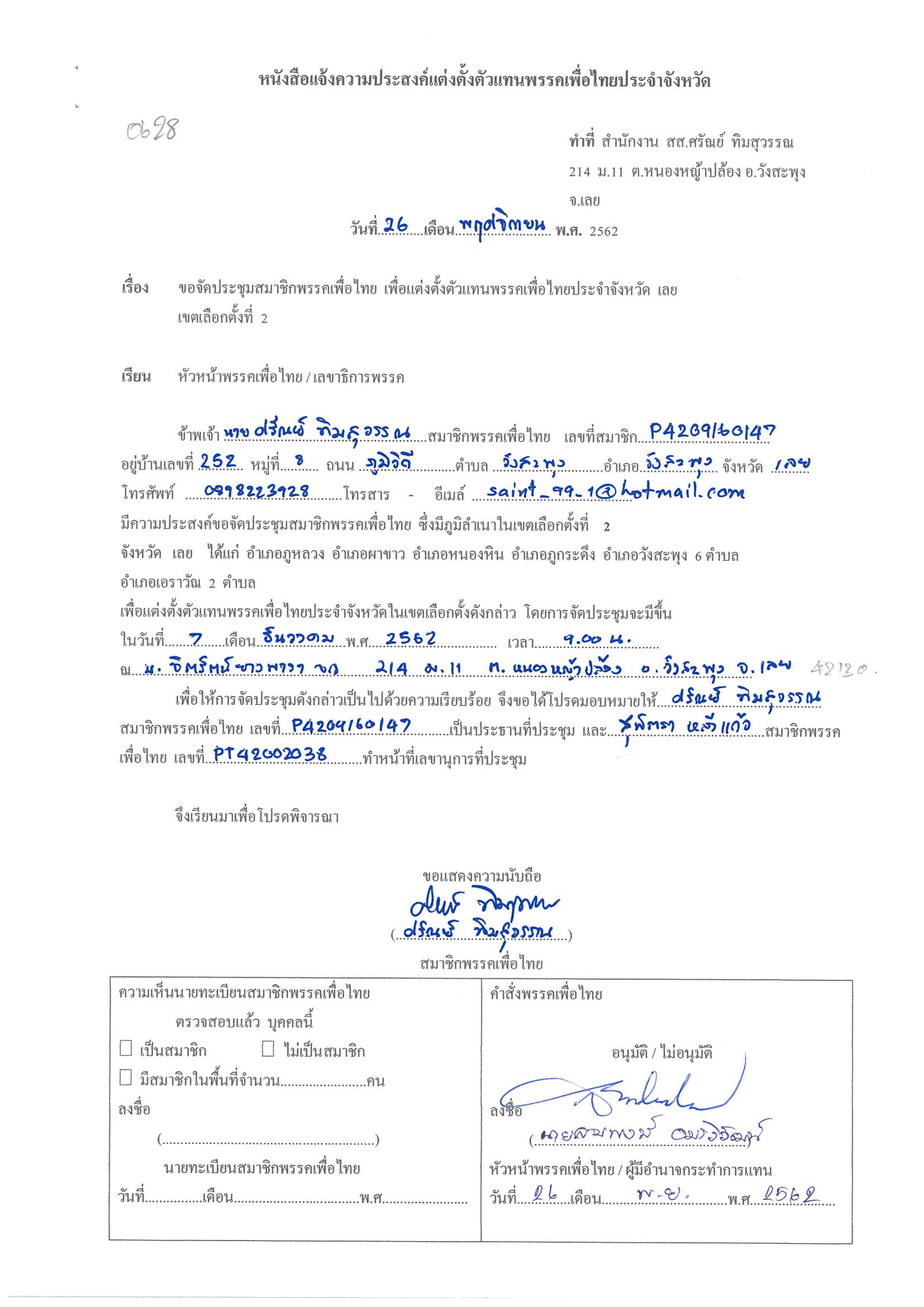 เชิญเข้าร่วมประชุมสมาชิกพรรค เพื่อแต่งตั้งตัวแทนพรรคประจำจังหวัดเลย เขตเลือกตั้งที่ 2