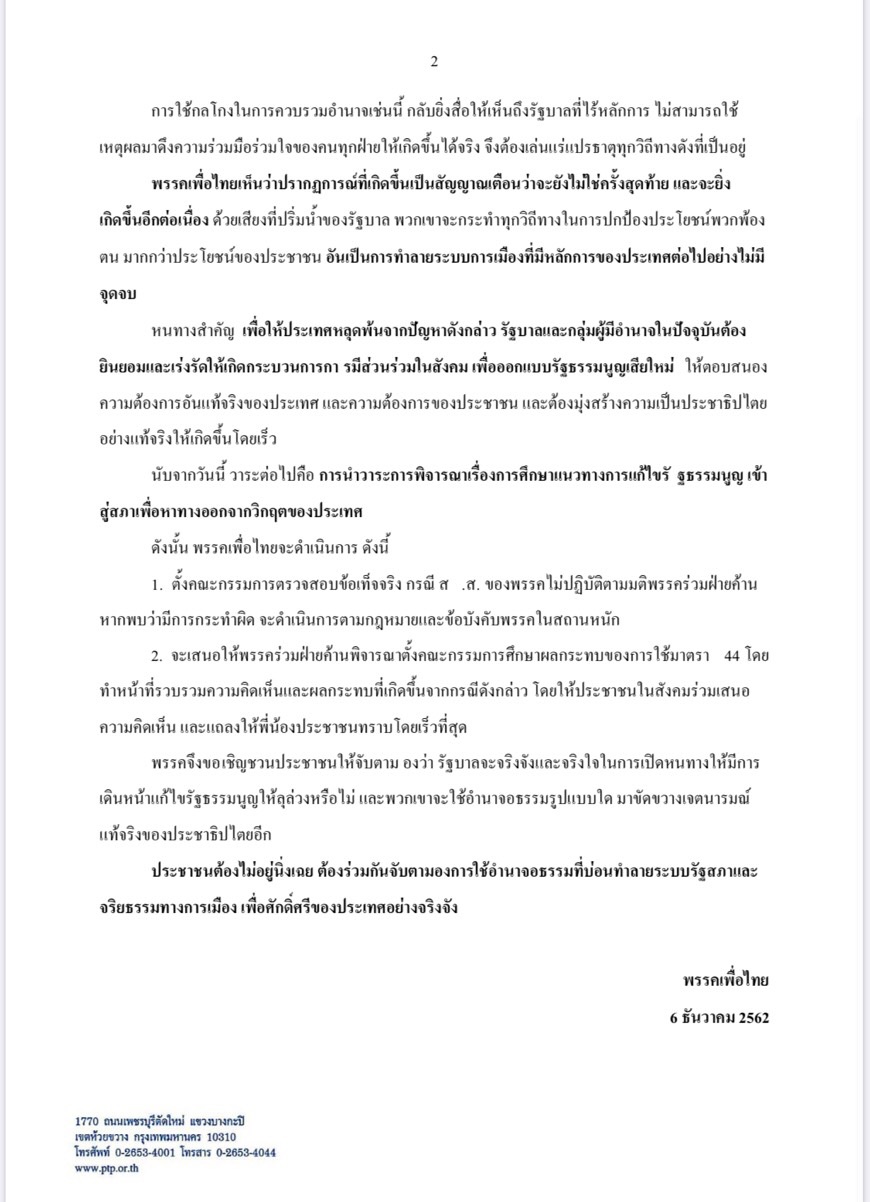 2. จะเสนอให้พรรคร่วมฝ่ายค้านพิจารณาตั้งคณะกรรมการศึกษาผลกระทบของการใช้มาตรา 44 โดยทำหน้าที่รวบรวมความคิดเห็นและผลกระทบที่เกิดขึ้นจากกรณีดังกล่าว โดยให้ประชาชนในสังคมร่วมเสนอความคิดเห็น และแถลงให้พี่น้องประชาชนทราบโดยเร็วที่สุด