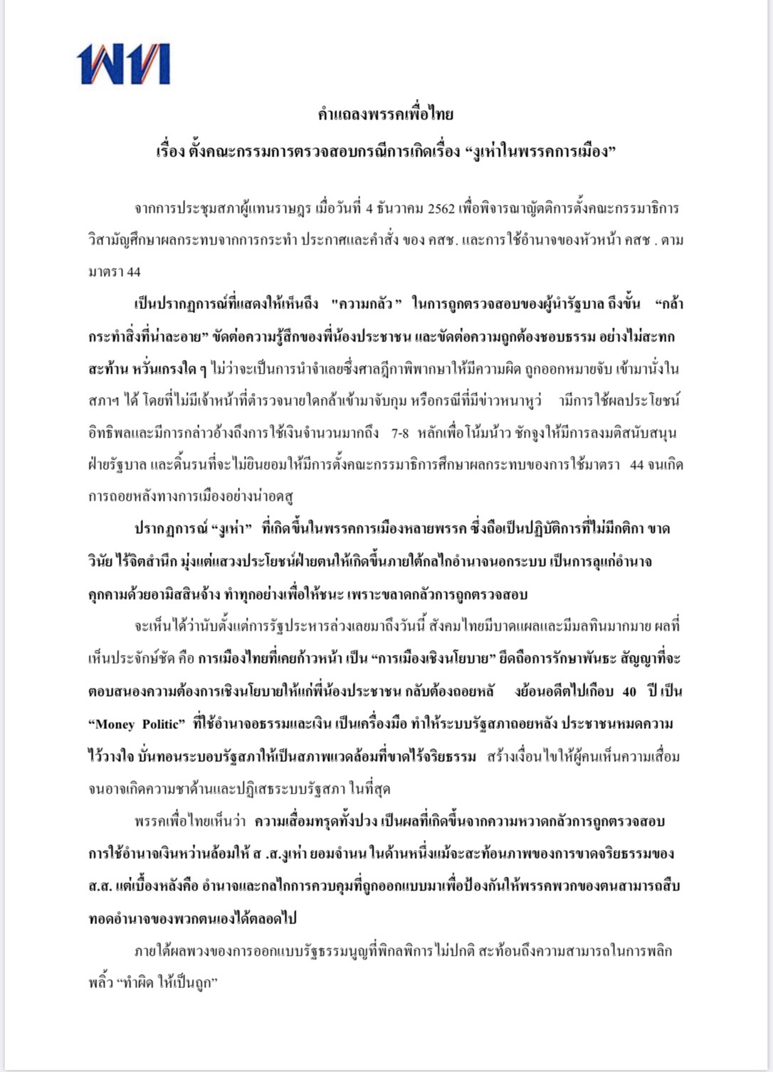 คำแถลงพรรคเพื่อไทย เรื่อง ตั้งคณะกรรมการตรวจสอบกรณีการเกิดเรื่อง “งูเห่าในพรรคการเมือง”