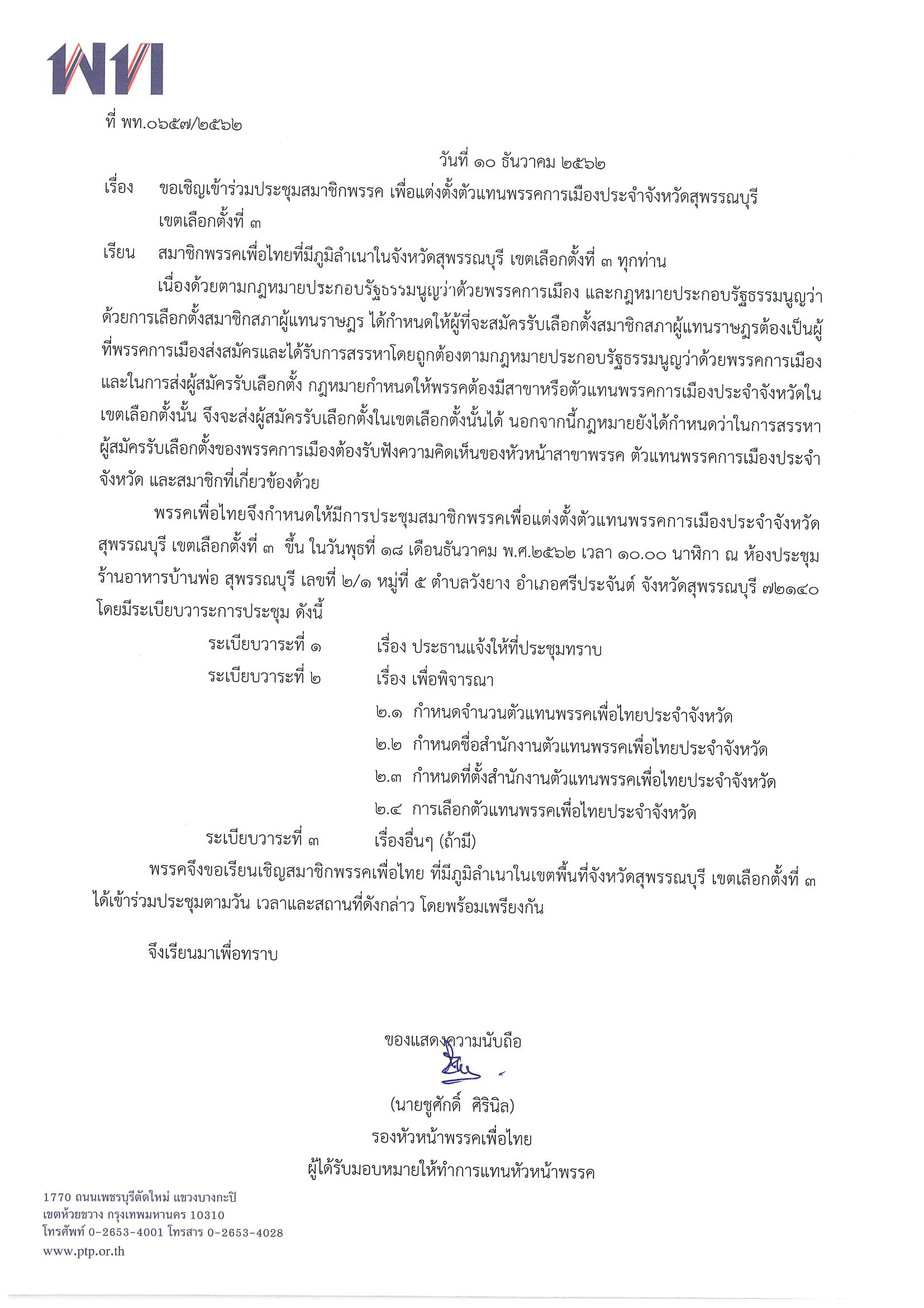 ขอเชิญเข้าร่วมประชุมสมาชิกพรรค เพื่อแต่งตั้งตัวแทนพรรคการเมืองประจำจังหวัดสุพรรณบุรี เขตเลือกตั้งที่ 3