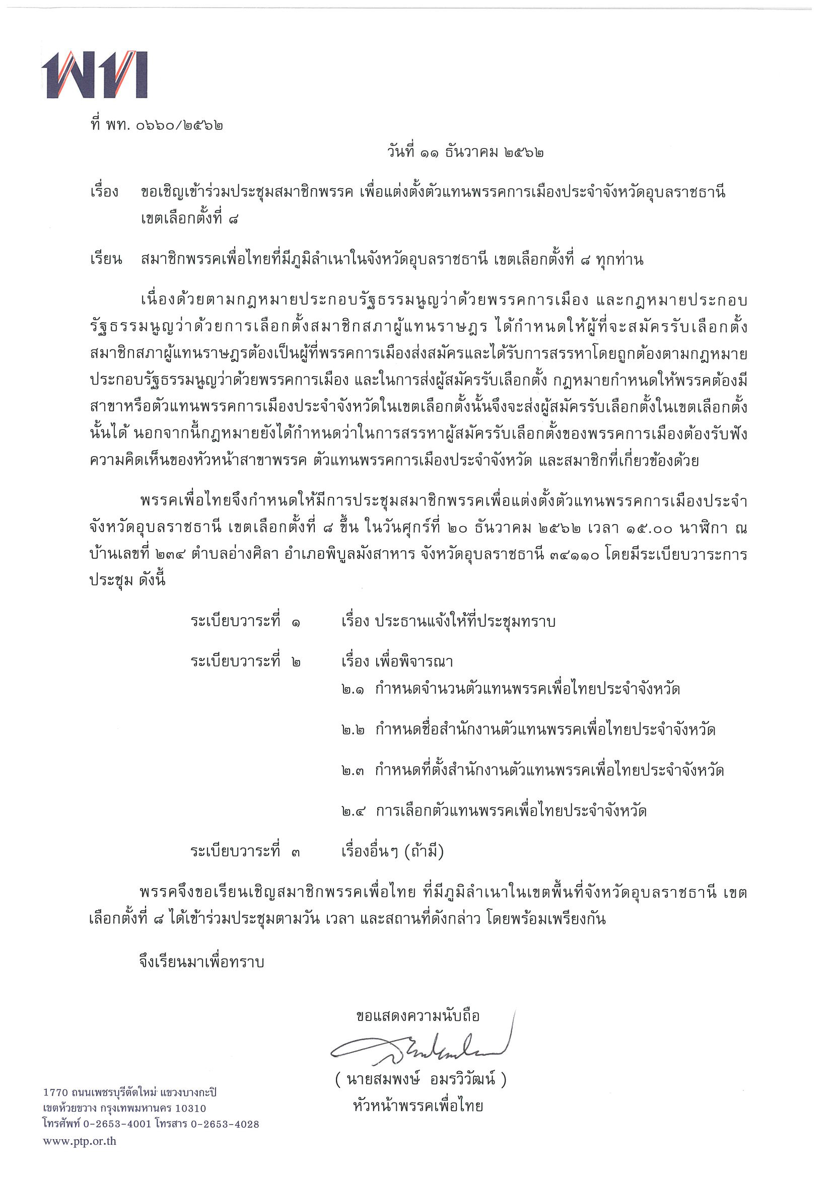 เชิญเข้าร่วมประชุมสมาชิกพรรค เพื่อแต่งตั้งตัวแทนพรรคประจำจังหวัดอุบลราชธานี เขตเลือกตั้งที่ 8
