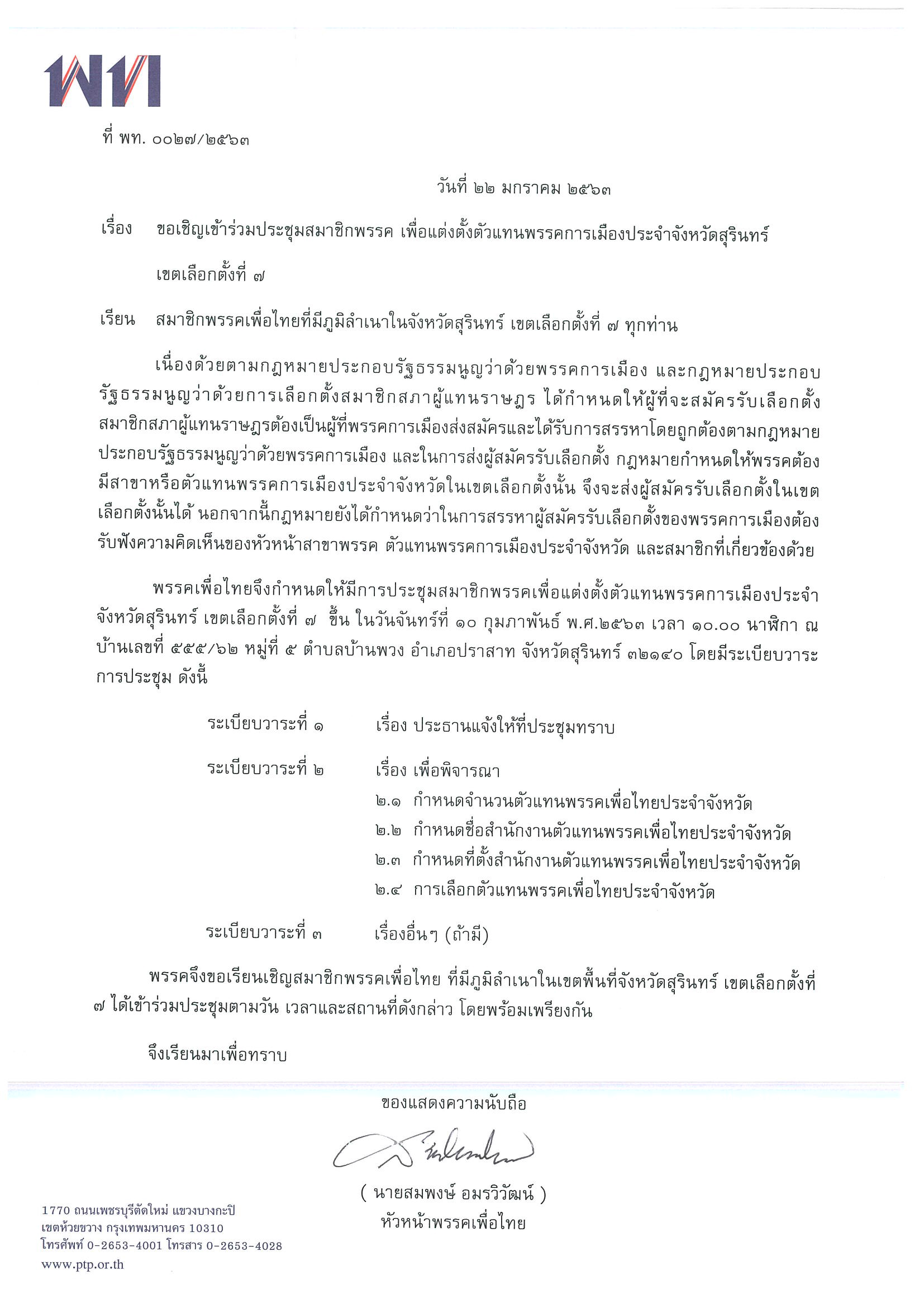 ขอเชิญเข้าร่วมประชุมสมาชิกพรรค เพื่อแต่งตั้งตัวแทนพรรคการเมืองประจำจังหวัดสุรินทร์ เขตเลือกตั้งที่ 7