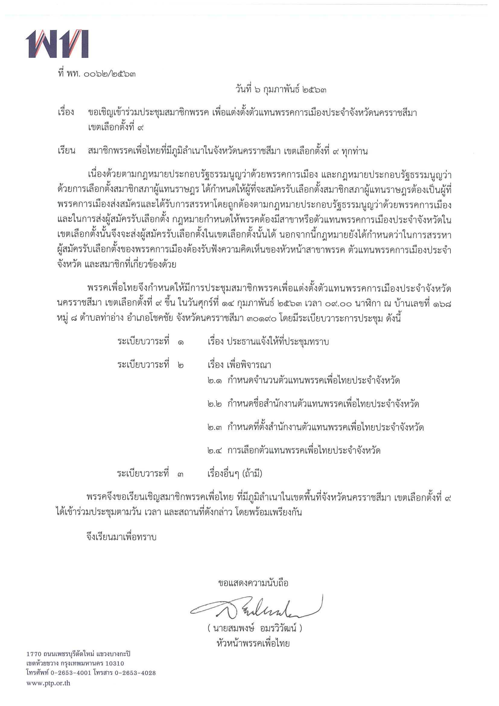 เชิญเข้าร่วมประชุมสมาชิกพรรค เพื่อแต่งตั้งตัวแทนพรรคประจำจังหวัดนครราชสีมา เขตเลือกตั้งที่ 9