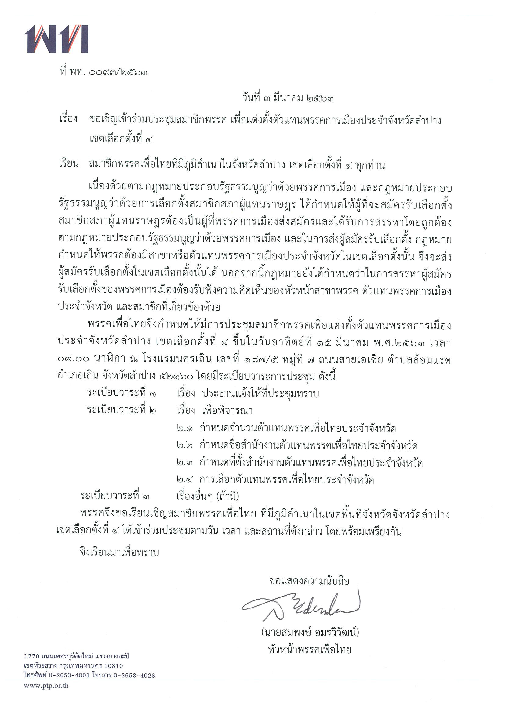 ขอเชิญเข้าร่วมประชุมสมาชิกพรรค เพื่อแต่งตั้งตัวแทนพรรคการเมืองประจำจังหวัดลำปาง เขตเลือกตั้งที่ 4